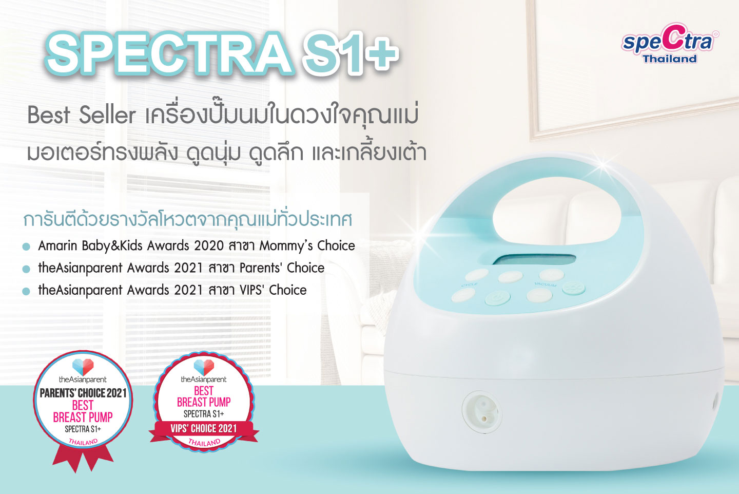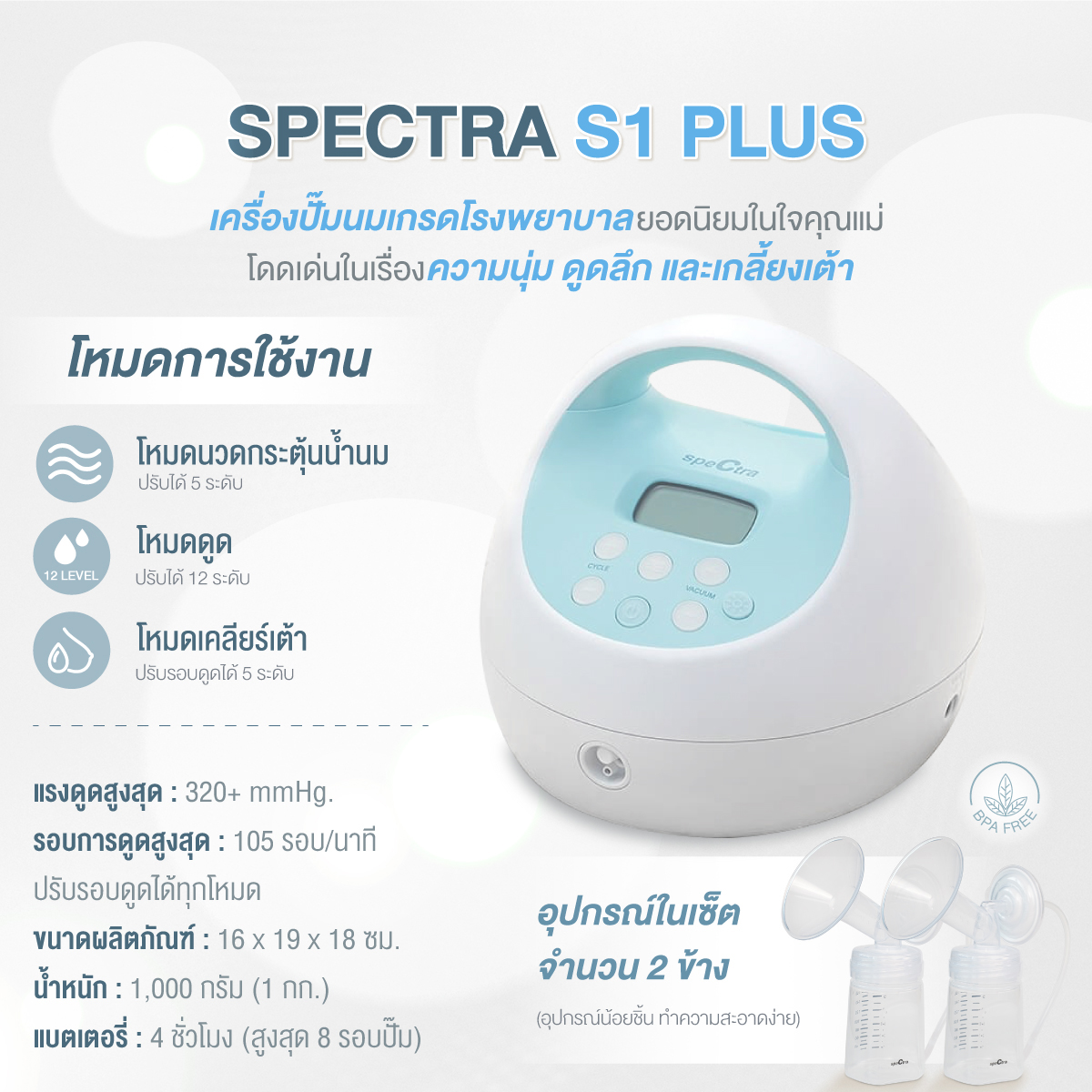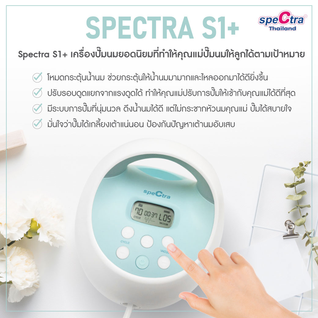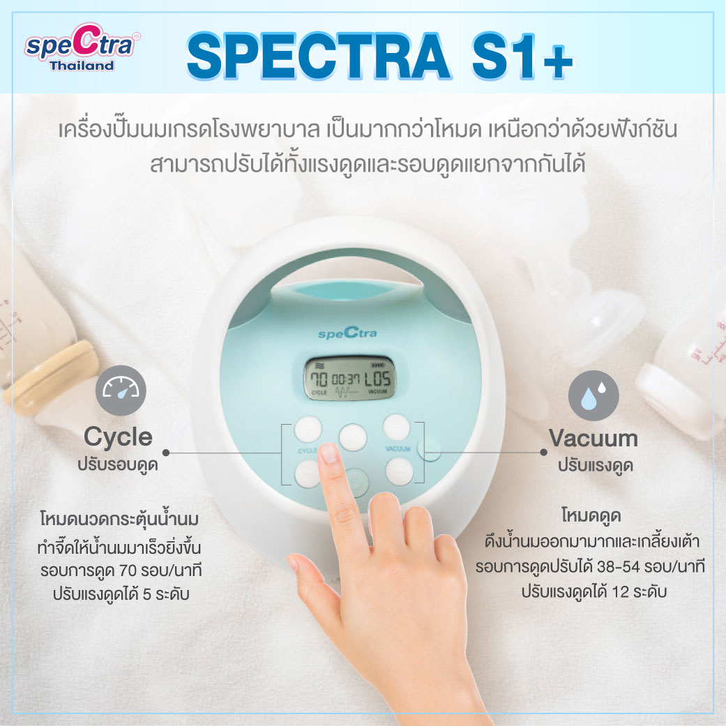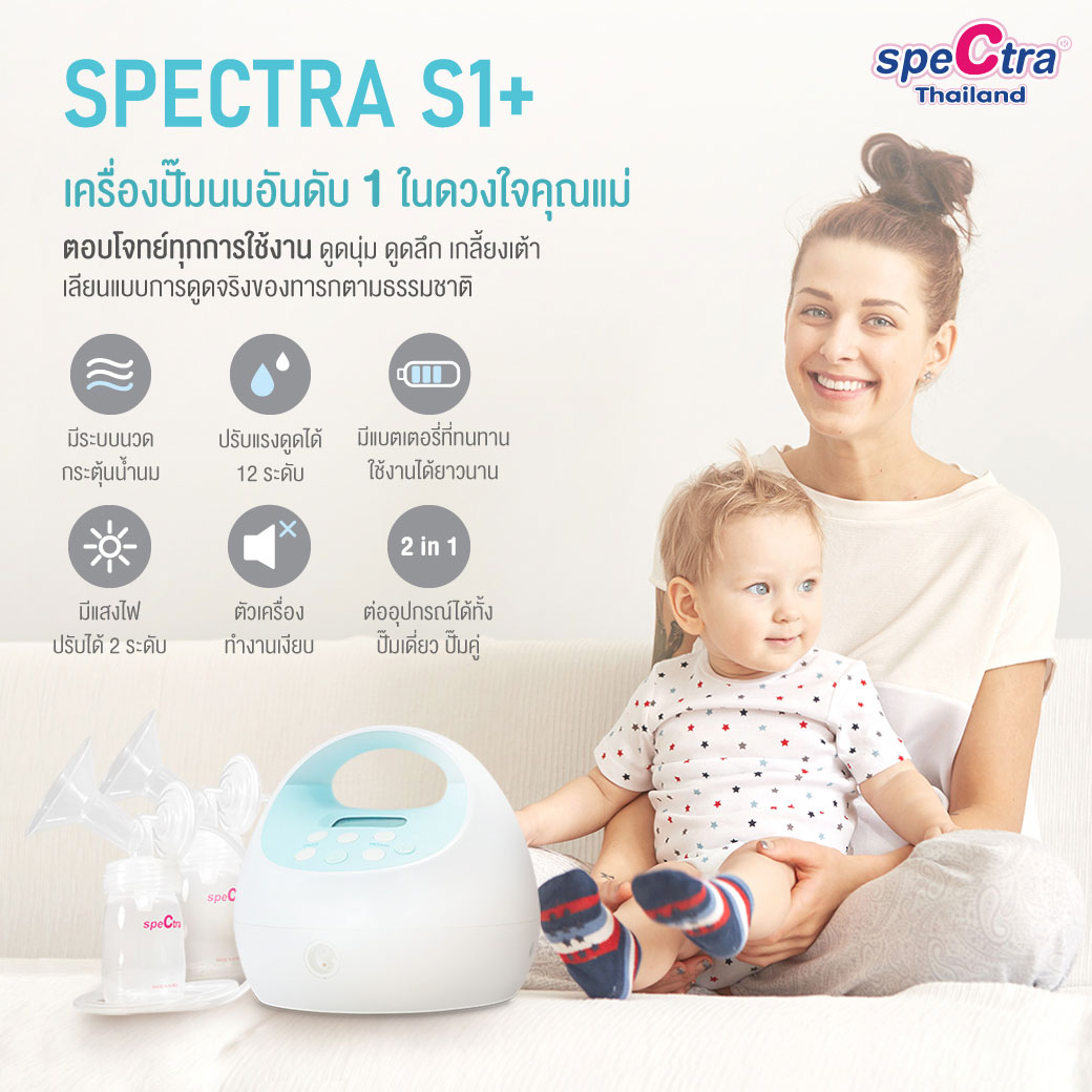 มาพร้อมระบบการทำงานที่ทันสมัย มีปุ่มปรับที่ใช้งานง่าย มีรอบการดูดแรงสูง และระบบนวดกระตุ้น ทำให้น้ำนมไหลออกได้ดียิ่งขึ้น จึงสามารถปั๊มน้ำนมได้เกลี้ยงเต้าในเวลาอันรวดเร็วและง่ายดาย ตัวเครื่องมีความแข็งแรงทนทาน ทำงานเงียบมาก และมีการดูดที่นุ่มนวลใกล้เคียงกับการดูดนมของทารกตามธรรมชาติมากที่สุด สามารถพกพาไปที่ต่างๆ ได้อย่างสะดวกเหมาะสำหรับคุณแม่ที่ปั๊มนมบ่อยครั้ง มีความตั้งใจจะเพิ่มปริมาณน้ำนมและทำสต๊อกนมให้นมลูกเป็นระยะเวลานาน Spectra S1 สามารถตอบโจทย์คุณแม่และลูกน้อยได้ดีที่สุด