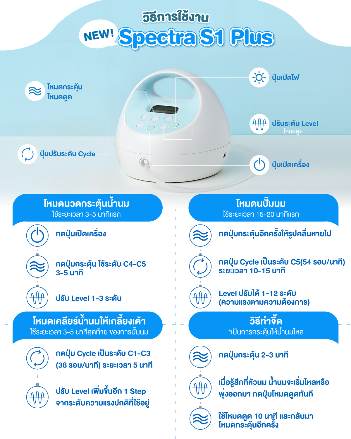- แนะนำใช้โหมดการกระตุ้นน้ำนม 3-5 นาที ก่อนการปั๊มโดยการใช้โหมดดูด ตามรอบการปั๊ม 30 นาที ถ้าหากปั๊มตามรอบครบ 30 นาที ยังรู้สึกไม่เกลี้ยงเต้าสามารถปั๊มต่อเนื่องจนกว่าจะเกลี้ยงเต้าได้ค่ะ