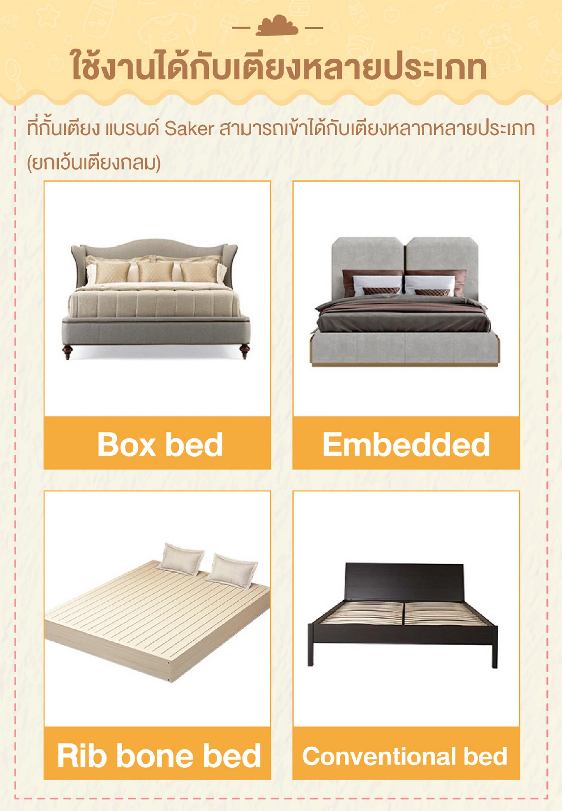 A-.ที่กั้นเตียง SAKER สามารถใช้ได้กับเตียงขนาด 6 ฟุตทุกแบบ ทั้งแบบมีขอบเตียงและไม่มีขอบเตียงค่ะ ติดตั้งได้แข็งแรงปลอดภัยค่ะ