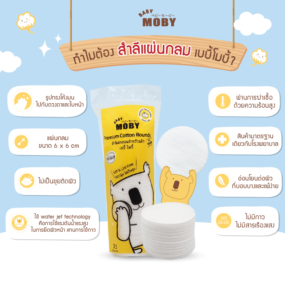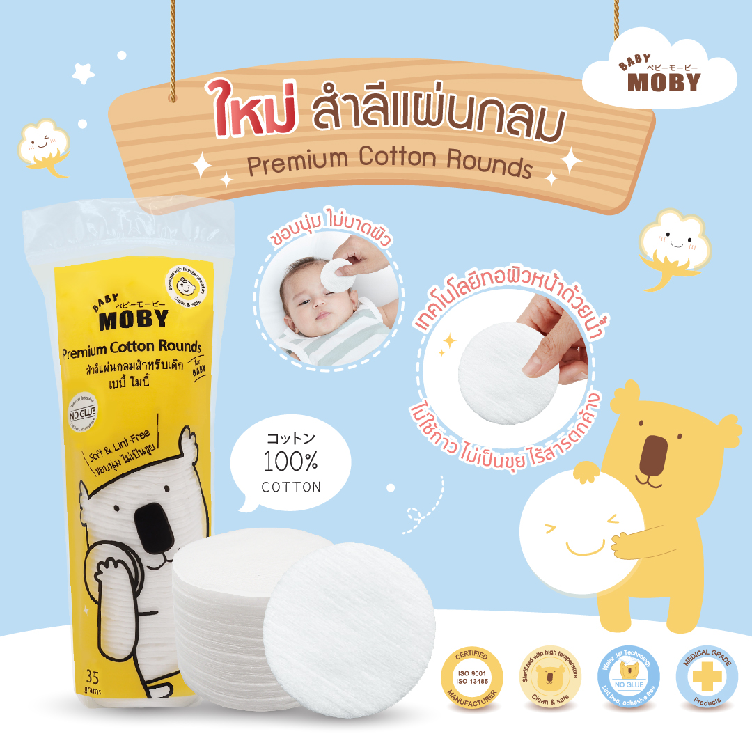 ใหม่ ! สำลีแผ่นกลมเบบี้ โมบี้ สำหรับเช็ดหน้าน้องโดยเฉพาะ ใบหน้าและรอบดวงตาที่บอบบางของทารกต้องเช็ดด้วยสัมผัสที่อ่อนโยน เช็ดทำความสะอาดใบหน้าลูกน้อยด้วยสำลีแผ่นกลมเบบี้ โมบี้ ขอบนุ่ม ไม่บาดผิว MOBY Premium Cotton Rounds New ! Baby Moby, round cotton pads for wiping face. A baby's delicate face and eyes must be wiped with a gentle touch. Wipe clean your baby's face with Baby Moby cotton pads, soft edges and is gentle on skin. * Water Jet Technology from Japan instead of using glue for binding, resulting in a soft, lint-free, glue-free and chemical-free surface. Suitable for the sensitive skin of newborns. * Made from 100% pure and thick cotton, super soft, helping clean the face completely. * Clean, safe, sterilized at high heat the same standard as hospitals. * Sheet size 6×6 cm. Suitable for baby's face * Specially designed for cleaning eyes and face. * Tested to be hypoallergenic even on sensitive skin (Hypoallergenic Tested) according to Japan DRC standard. * Contains 35 grams |