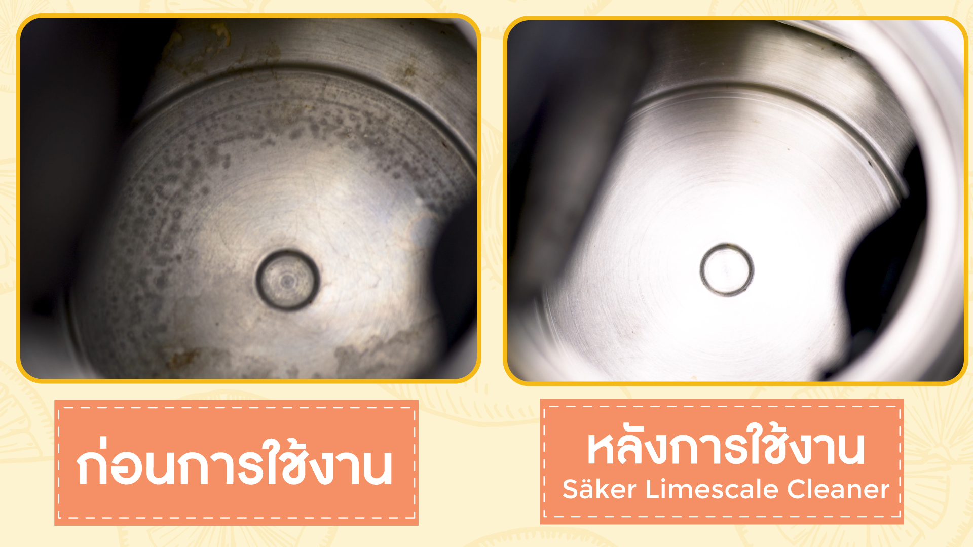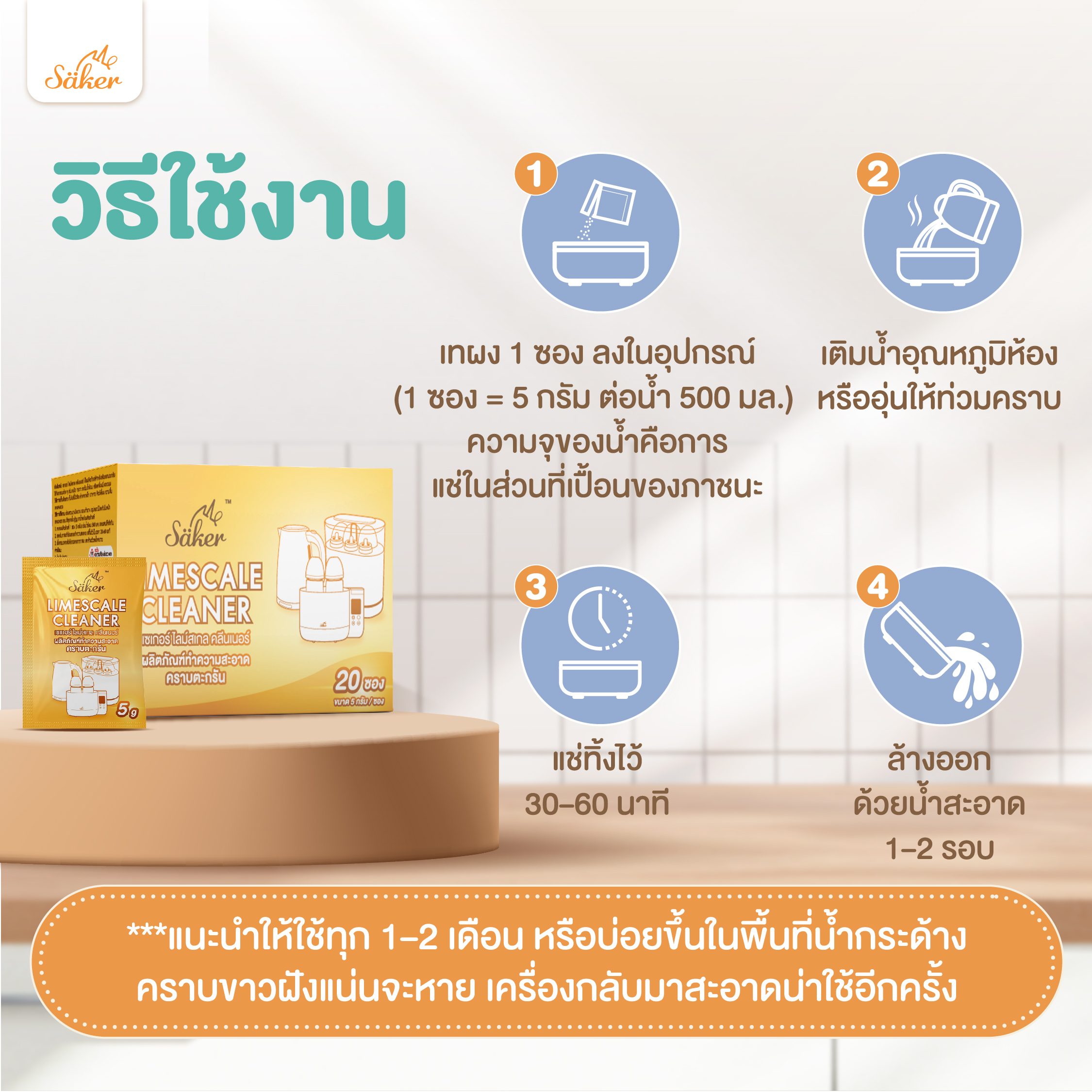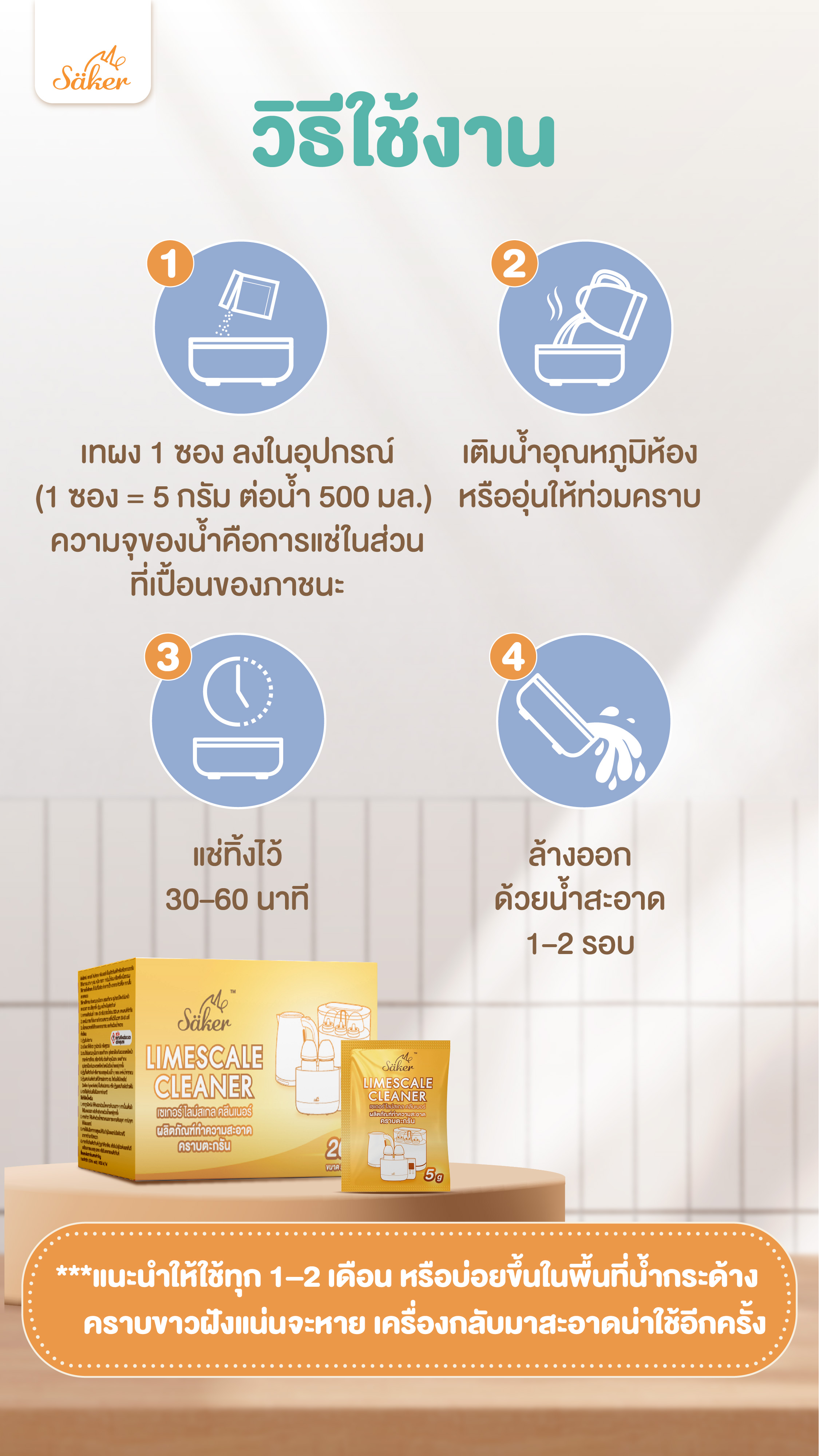 -A.การใช้งาน Saker Limescale Cleaner ง่ายๆ เพียงฉีกซองเทผงขจัดคราบลงบนคราบตะกรัน 1 ซอง และเทน้ำร้อน 500 ml. ผสมลงไป