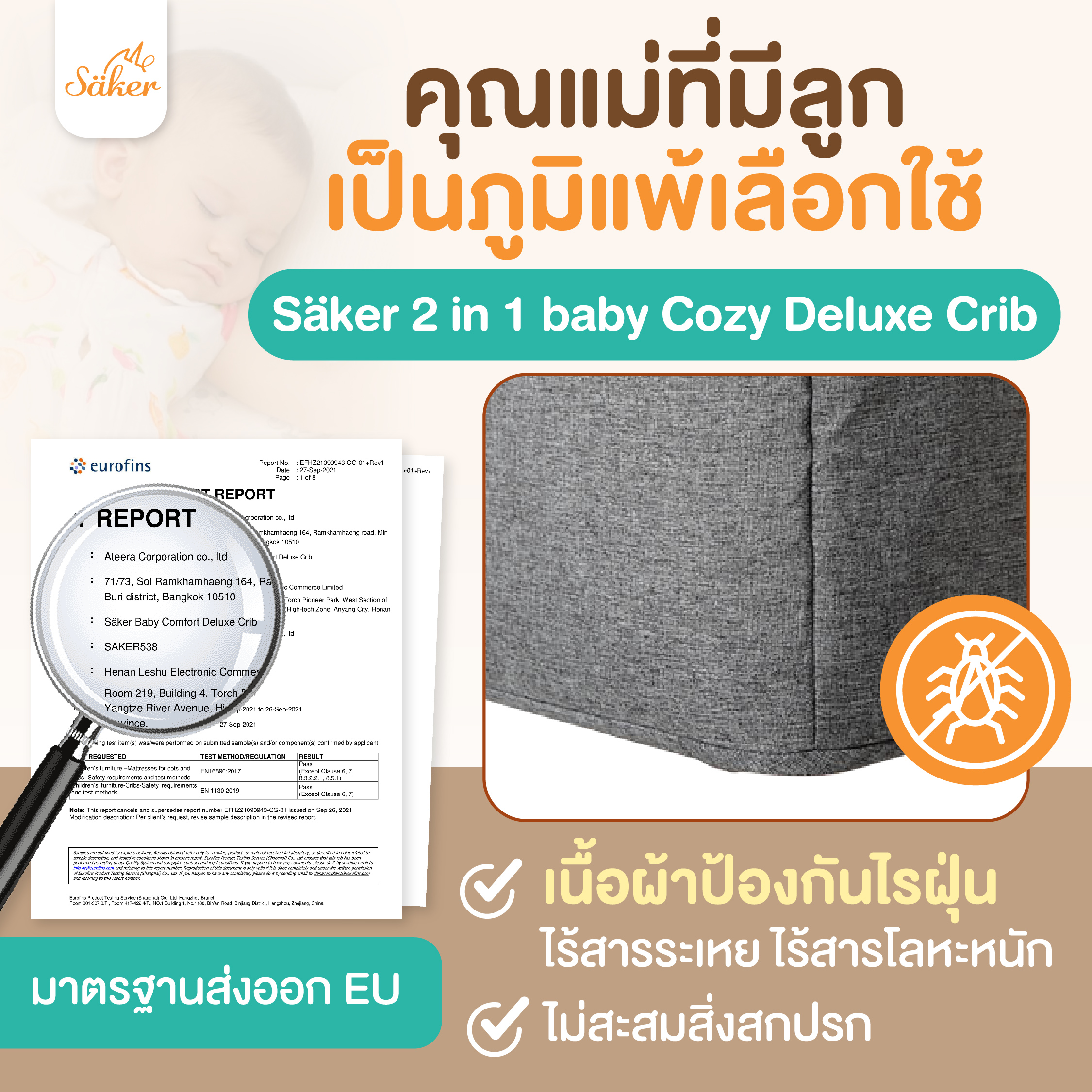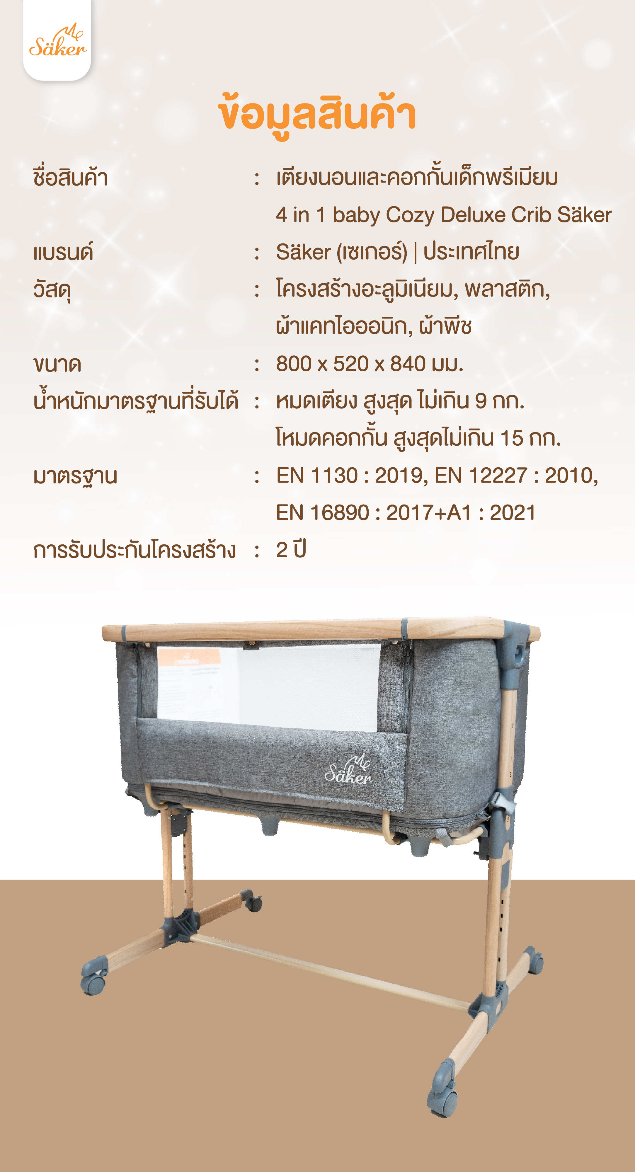 📝ข้อมูลสินค้า ชื่อสินค้า : เตียงนอนและคอกกั้นเด็กพรีเมี่ยม 4 in 1 baby Cozy Deluxe Crib Säker แบรนด์ : Säker (เซเกอร์) | ประเทศไทย วัสดุ : โครงสร้างอะลูมิเนียม, พลาสติก, ผ้าแคทไอออนิก, ผ้าพีช ขนาด : 800 x 520 x 840 มม. น้ำหนักมาตรฐานที่รับได้ : โหมดเตียง สูงสุด ไม่เกิน 9 กก. โหมดคอกกั้น สูงสุดไม่เกิน 15 กก. มาตรฐาน : EN 1130 : 2019, EN 12227 : 2010, EN 16890 : 2017+A1 : 2021 การรับประกันโครงสร้าง : 2 ปี