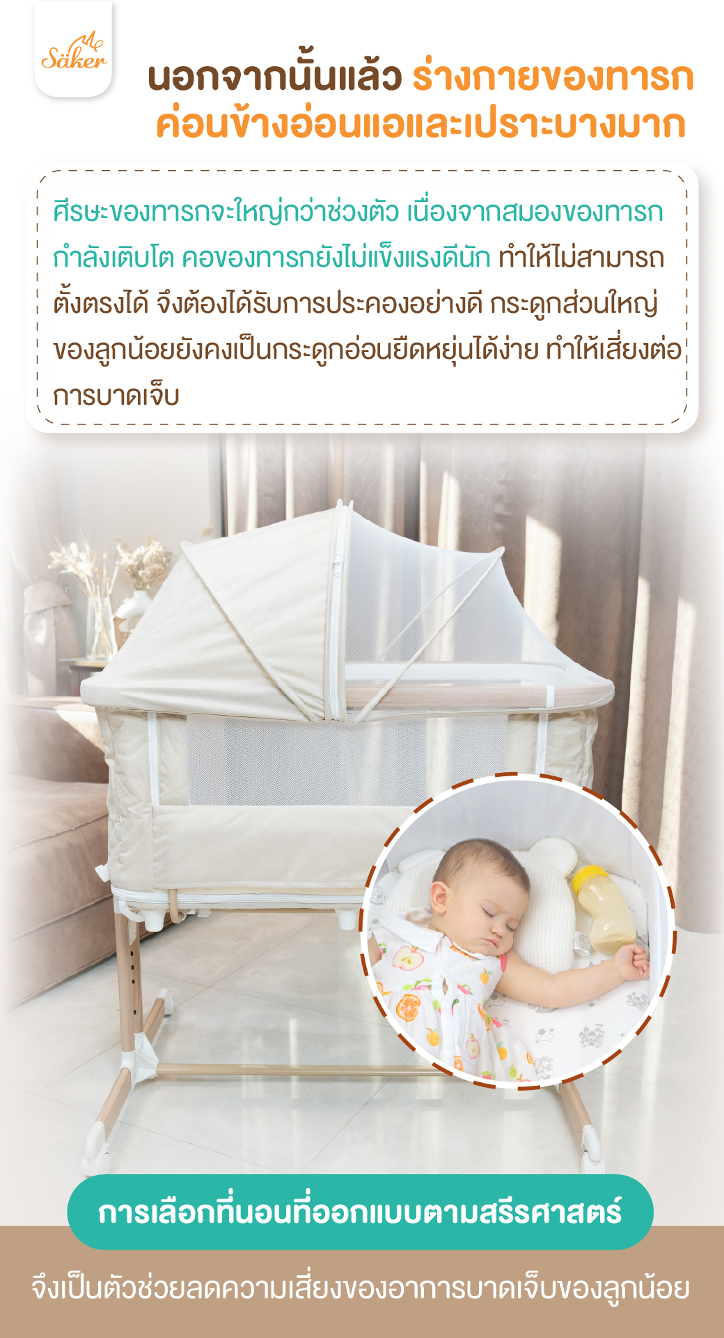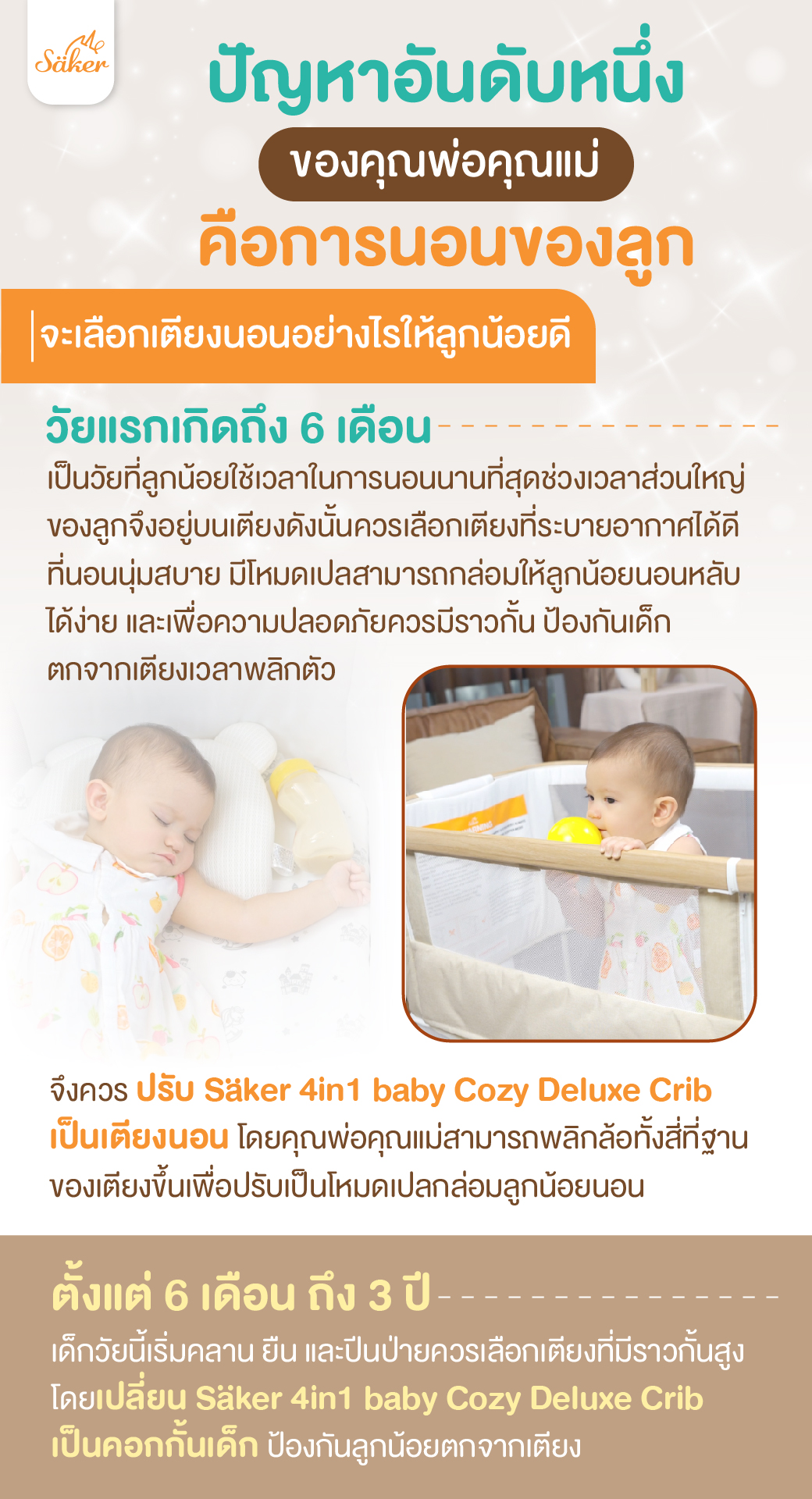 📌ปัญหาอันดับหนึ่งของคุณพ่อคุณแม่ คือการนอนของลูก‼️ จะเลือกเตียงนอนอย่างไรให้ลูกน้อยดี💡❓ 🔺วัยแรกเกิดถึง 6 เดือน เป็นวัยที่ลูกน้อยใช้เวลาในการนอนนานที่สุด ช่วงเวลาส่วนใหญ่ของลูกจึงอยู่บนเตียง ดังนั้นควรเลือกเตียงที่ระบายอากาศได้ดี ที่นอนนุ่มสบาย มีโหมดเปลสามารถกล่อมให้ลูกน้อยนอนหลับได้ง่าย และเพื่อความปลอดภัยควรมีราวกั้น ป้องกันเด็กตกจากเตียงเวลาพลิกตัว จึงควรปรับ Säker 4in1 baby Cozy Deluxe Crib เป็นเตียงนอน โดยคุณพ่อคุณแม่สามารถพลิกล้อทั้งสี่ที่ฐานของเตียงขึ้น เพื่อปรับเป็นโหมดเปลกล่อมลูกน้อยนอน 🔺ตั้งแต่ 6 เดือน ถึง 3 ปี เด็กวัยนี้เริ่มคลาน ยืน และปีนป่าย ควรเลือกเตียงที่มีราวกั้นสูง โดยเปลี่ยน Säker 4in1 baby Cozy Deluxe Crib เป็นคอกกั้นเด็ก ป้องกันลูกน้อยตกจากเตียง
