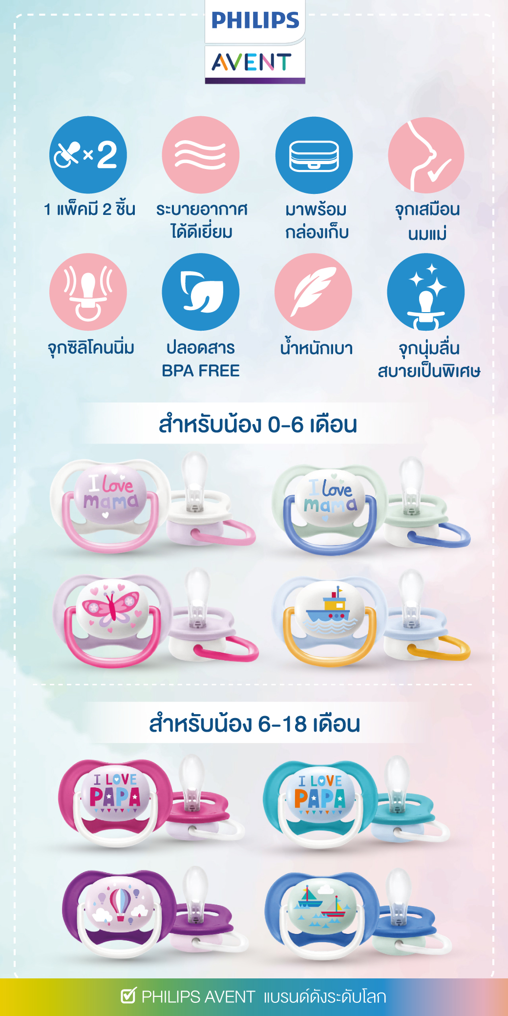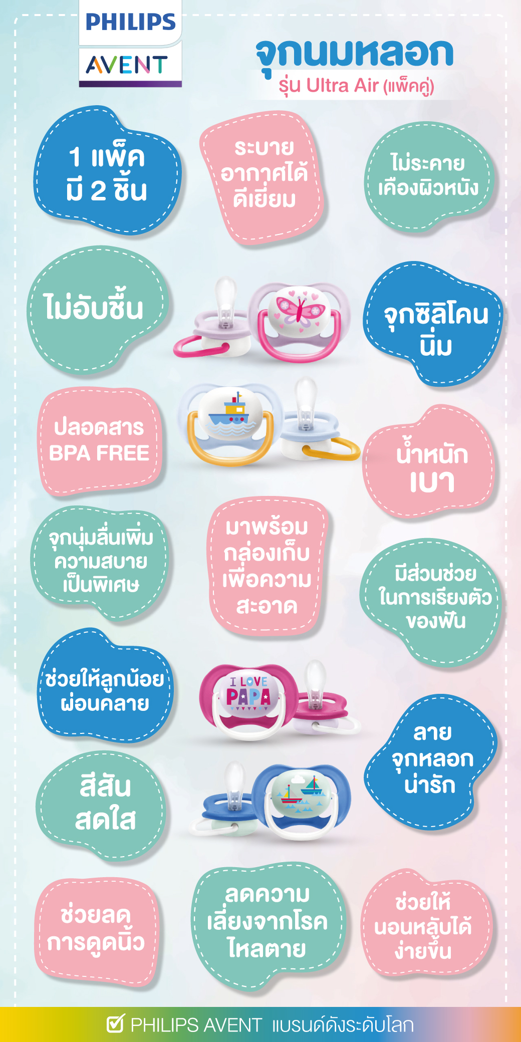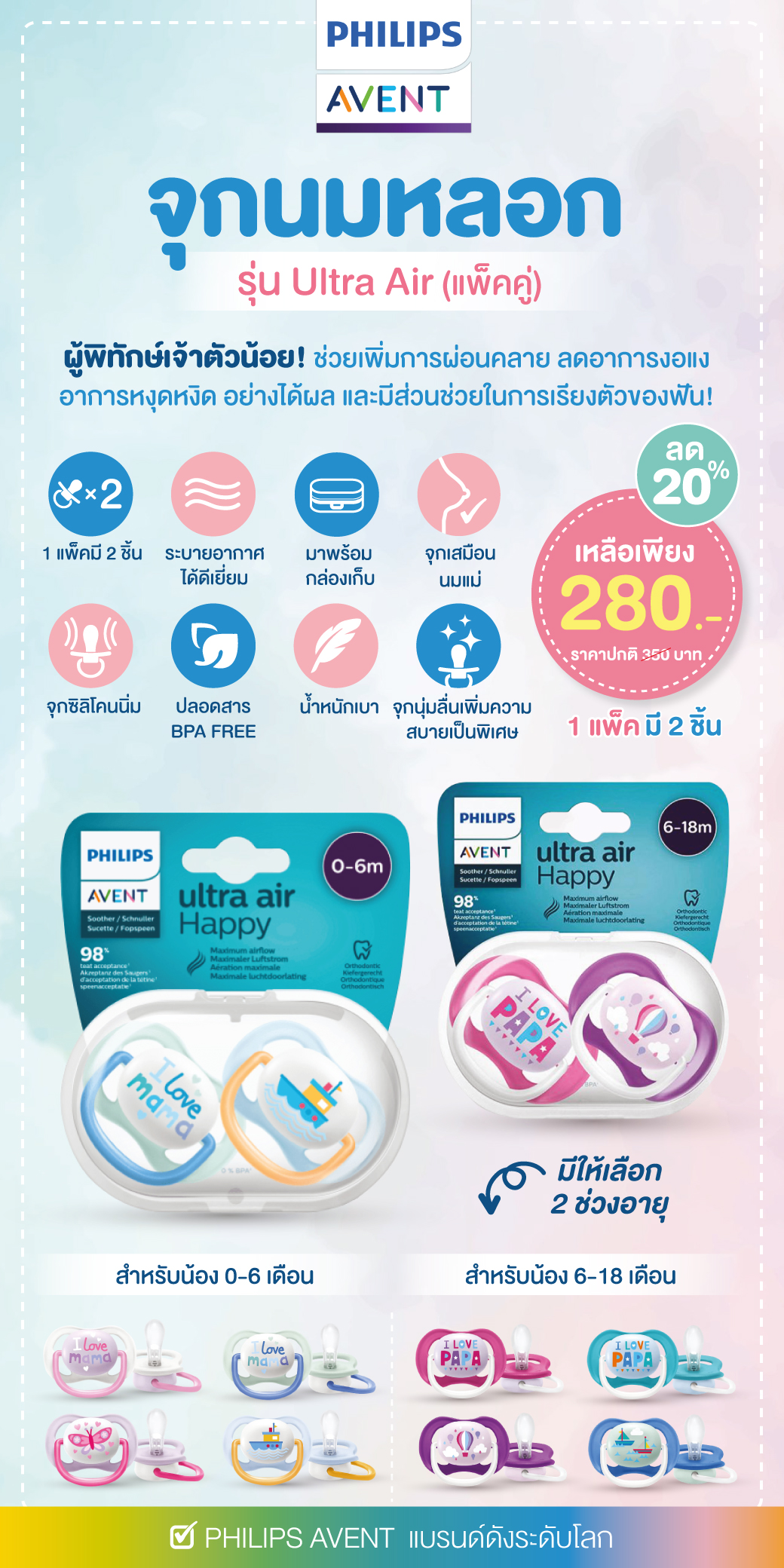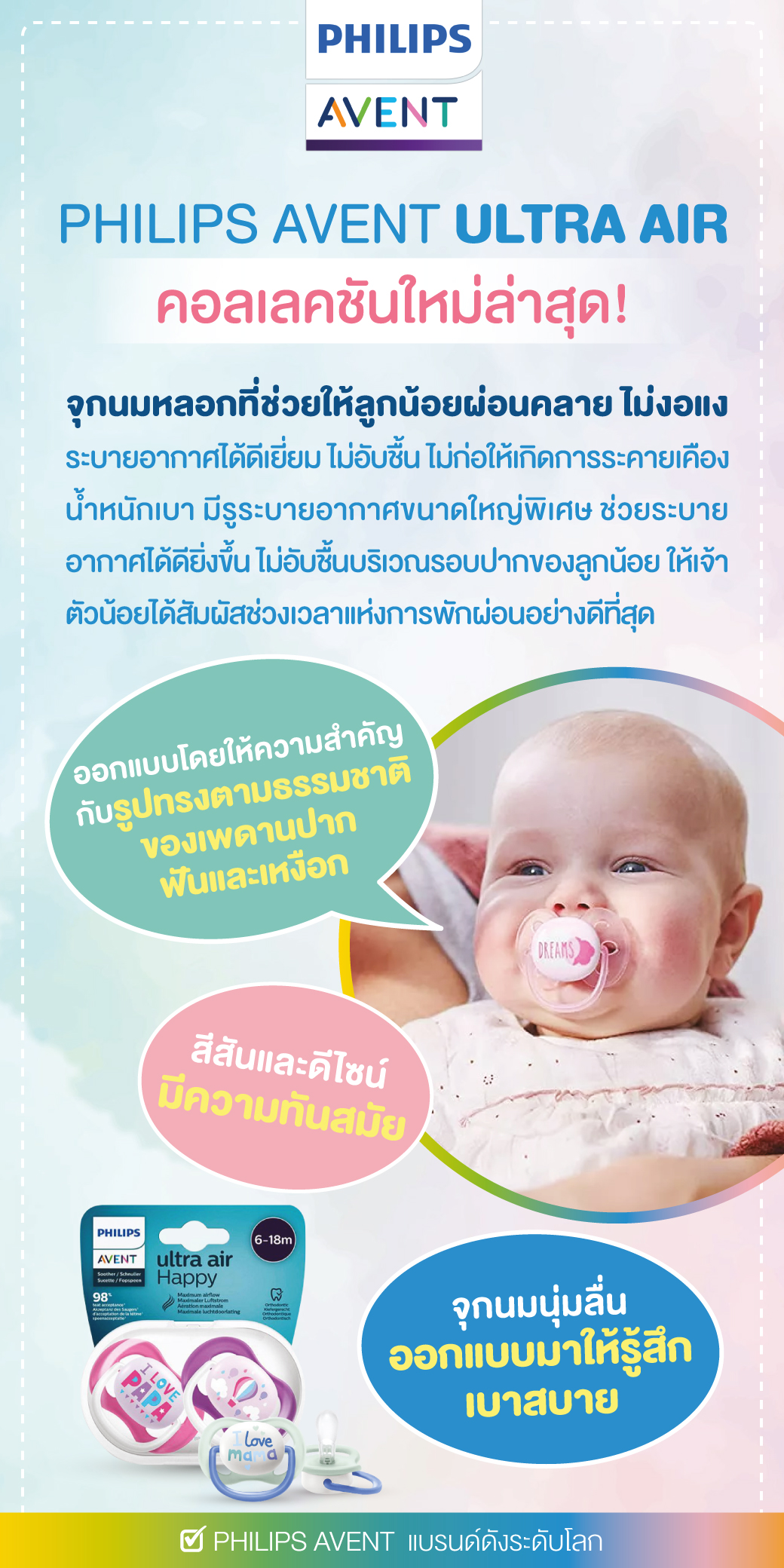 Philips Avent Ultra Air คอลเลคชันใหม่ล่าสุด! จุกนมหลอกที่ช่วยให้ลูกน้อยผ่อนคลาย ไม่งอแง ระบายอากาศได้ดีเยี่ยม ไม่ก่อให้เกิดการระคายเคือง น้ำหนักเบา มีรูระบายอากาศขนาดใหญ่พิเศษ ช่วยระบายอากาศได้ดียิ่งขึ้น ไม่อับชื้นบริเวณรอบปากของลูกน้อย ให้เจ้าตัวน้อยได้สัมผัสช่วงเวลาแห่งการพักผ่อนอย่างดีที่สุด