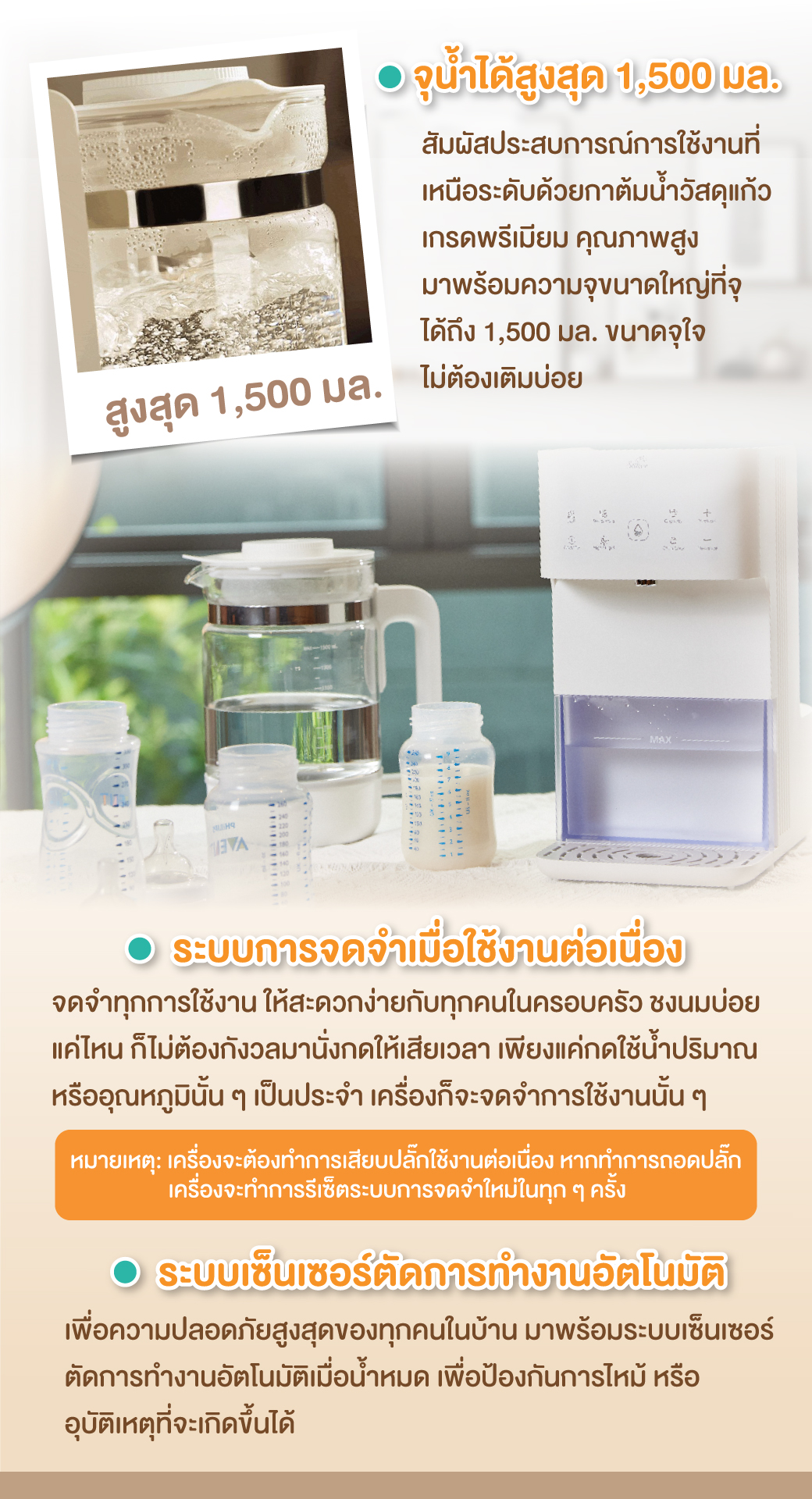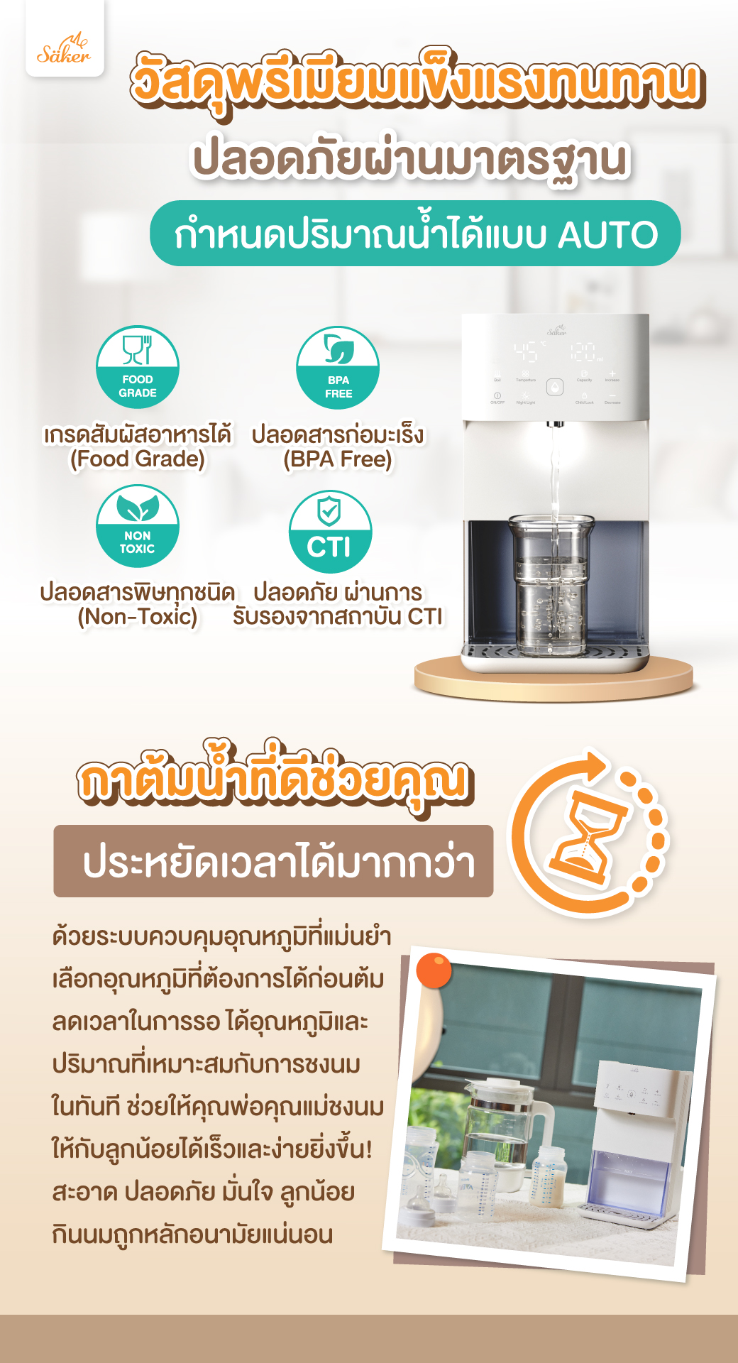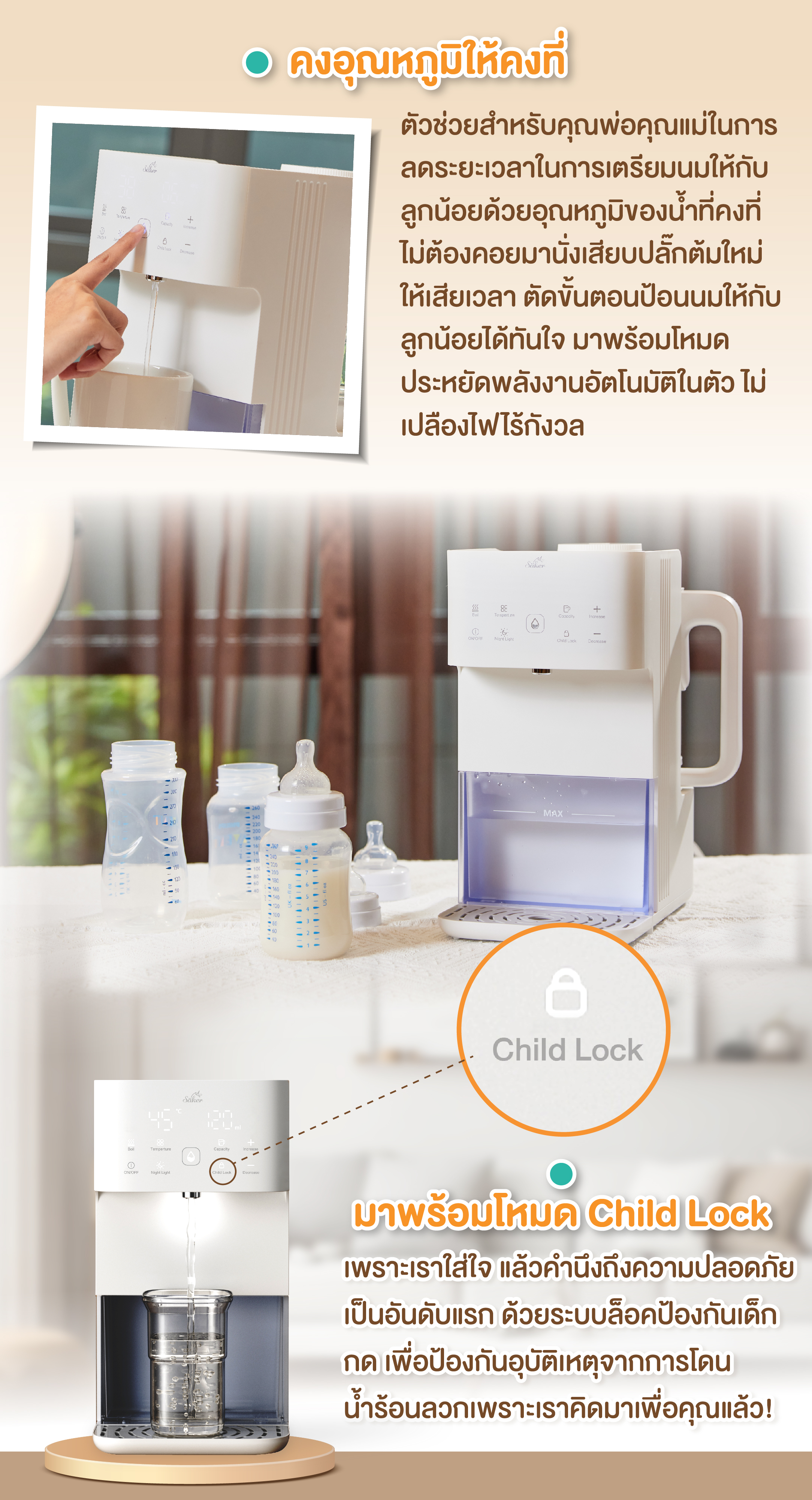 ตัวช่วยสำหรับคุณพ่อคุณแม่ในการลดระยะเวลาในการเตรียมนมให้กับลูกน้อย ด้วยอุณหภูมิของน้ำที่คงที่ ไม่ต้องคอยมานั่งเสียบปลั๊กต้มใหม่ให้เสียเวลา ตัดขั้นตอน ป้อนนมให้กับลูกน้อยได้ทันใจ มาพร้อมโหมดประหยัดพลังงานอัตโนมัติในตัว ไม่เปลืองไฟ ไร้กังวล