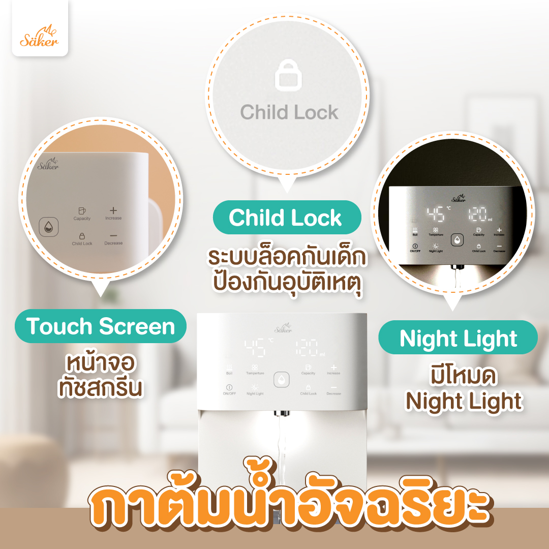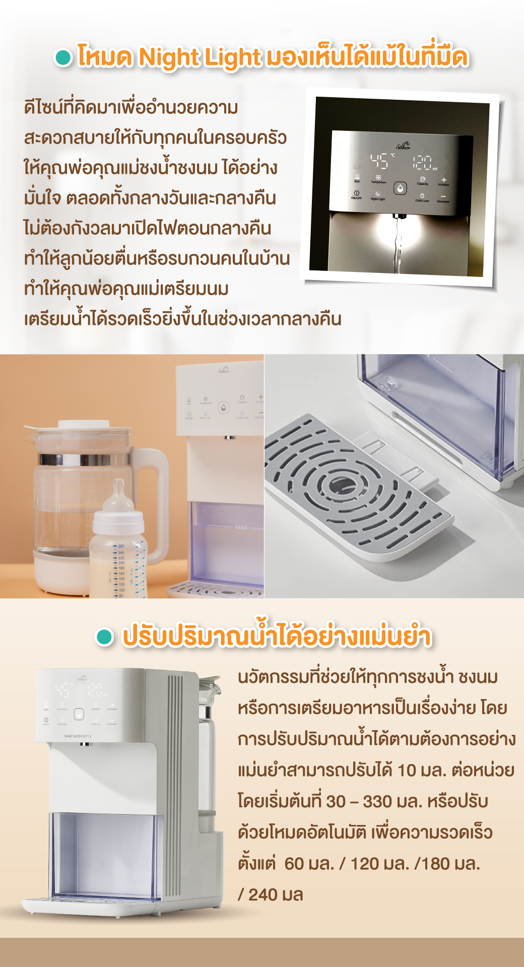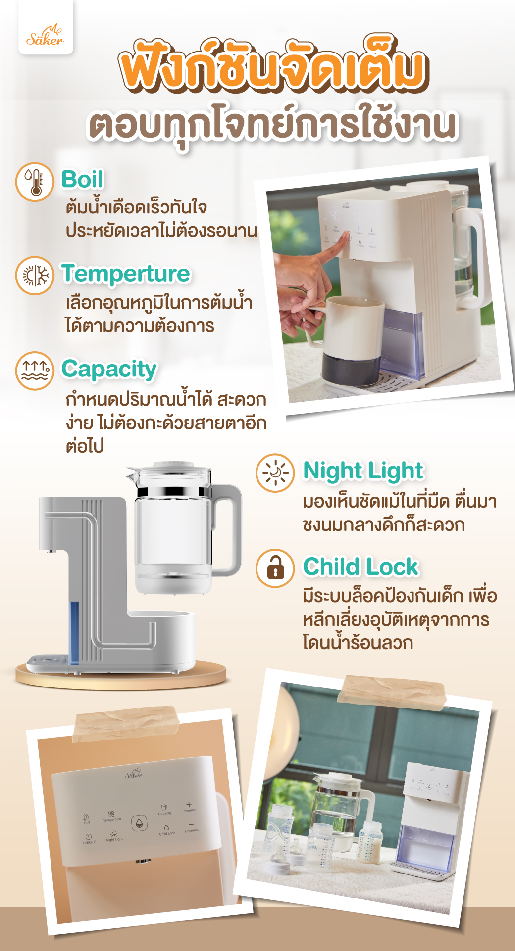 ดีไซน์ที่คิดมาเพื่ออำนวยความสะดวกสบายให้กับทุกคนในครอบครัว ให้คุณพ่อคุณแม่ชงน้ำ ชงนม ได้อย่างมั่นใจตลอดทั้งกลางวันและกลางคืน ไม่ต้องกังวลมาเปิดไฟตอนกลางคืน ทำให้ลูกน้อยตื่นหรือรบกวนคนในบ้าน ทำให้คุณพ่อคุณแม่เตรียมนม เตรียมน้ำได้รวดเร็วยิ่งขึ้นในช่วงเวลากลางคืน