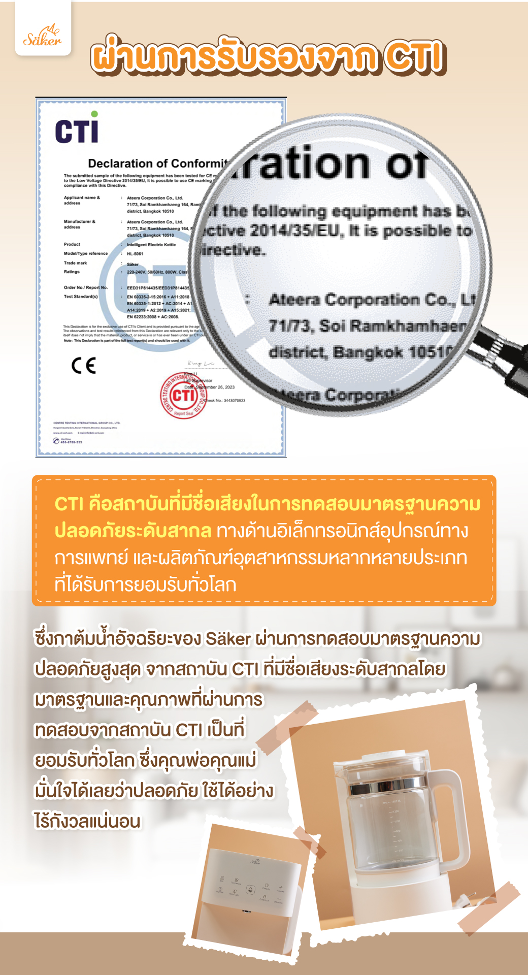ซึ่งกาต้มน้ำอัจฉริยะของ Säker ผ่านการทดสอบมาตรฐานความปลอดภัยสูงสุด จากสถาบัน CTI ที่มีชื่อเสียงระดับสากลโดยมาตรฐานและคุณภาพที่ผ่านการทดสอบจากสถาบัน CTI เป็นที่ยอมรับทั่วโลก ซึ่งคุณพ่อคุณแม่มั่นใจได้เลยว่า ปลอดภัย ใช้ได้อย่างไร้กังวลแน่นอน