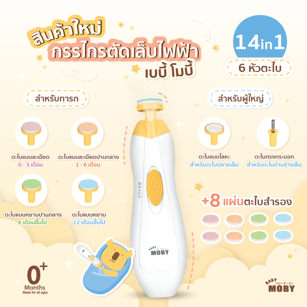 Electric baby nail trimmer ใช้งานง่าย ปลอดภัย ไม่เข้าเนื้อ ไร้เสียงรบกวน มาพร้อมไฟส่องสว่าง 14 in 1 : 14 หัวเปลี่ยน ( 6 หัวเปลี่ยน และ 8 แผ่นตะไบสำรอง) ใช้ได้ยาวนานทั้งครอบครัว • หมุน 360 องศา ทั้งซ้ายและขวา ปรับความแรงได้ 2 ระดับ • ขนาดกระทัดรัด ออกแบบให้จับถนัดมือ • เสียงเงียบ ไม่รบกวนการนอน • มีไฟ LED ส่องสว่าง สำหรับใช้งานในที่แสงน้อย • มีระบบหยุดอัตโนมัติเมื่อกดแรงเกินไป เพื่อความปลอดภัย • คุณภาพสูง ทนทาน • มาพร้อมกล่องเก็บ เพื่อความเป็นระเบียบ • ใช้ได้ตั้งแต่แรกเกิด ใช้ได้ทั้งครอบครัว • ใช้งานด้วยถ่าย AA 2 ก้อน |