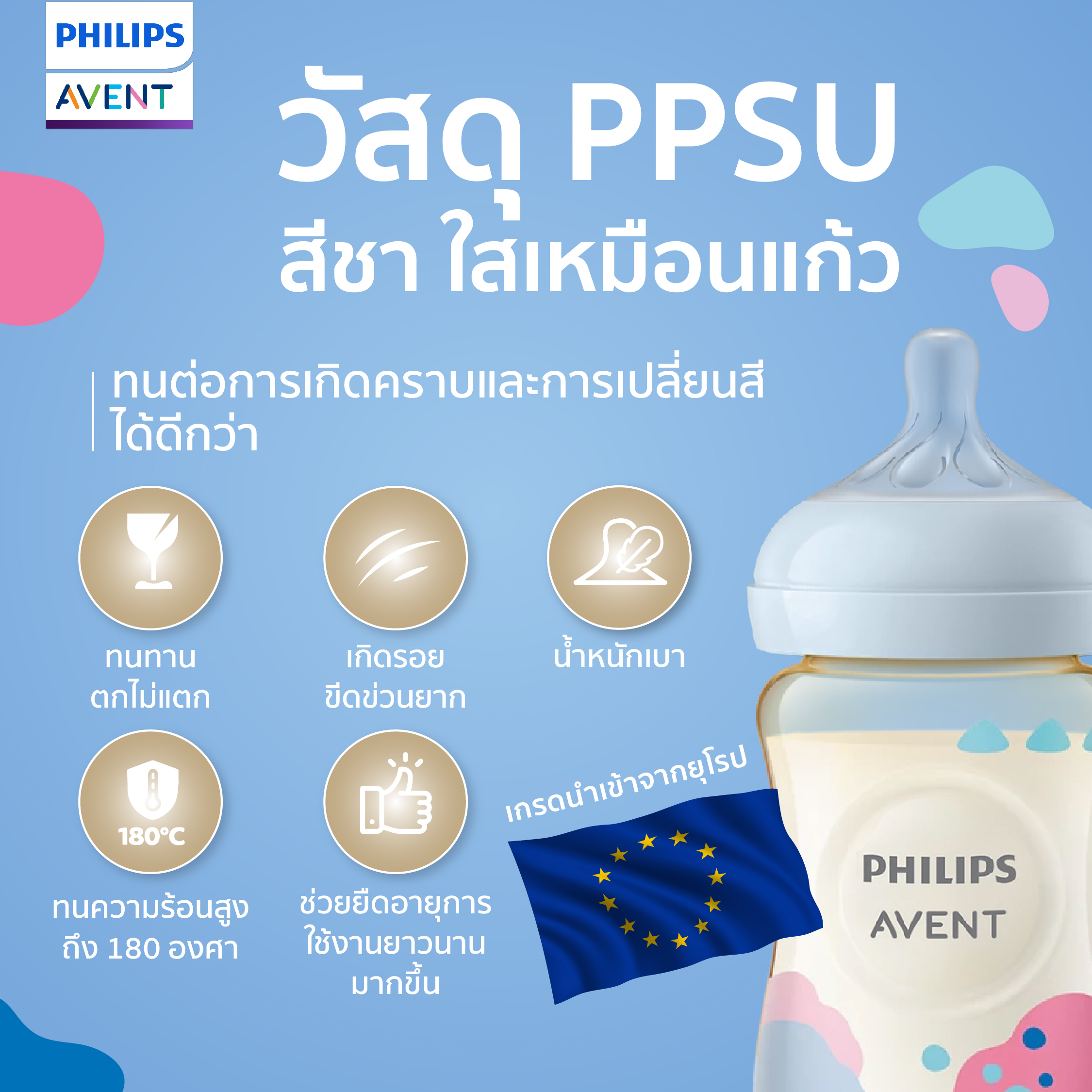 ขวดนม PPSU มีลักษณะใส ทนต่อการเกิดคราบหรือการเปลี่ยนสี ช่วยให้ขวดดูใหม่และสะอาดทุกครั้ง ทำให้ดูน่าใช้และไม่ต้องเปลี่ยนขวดบ่อย