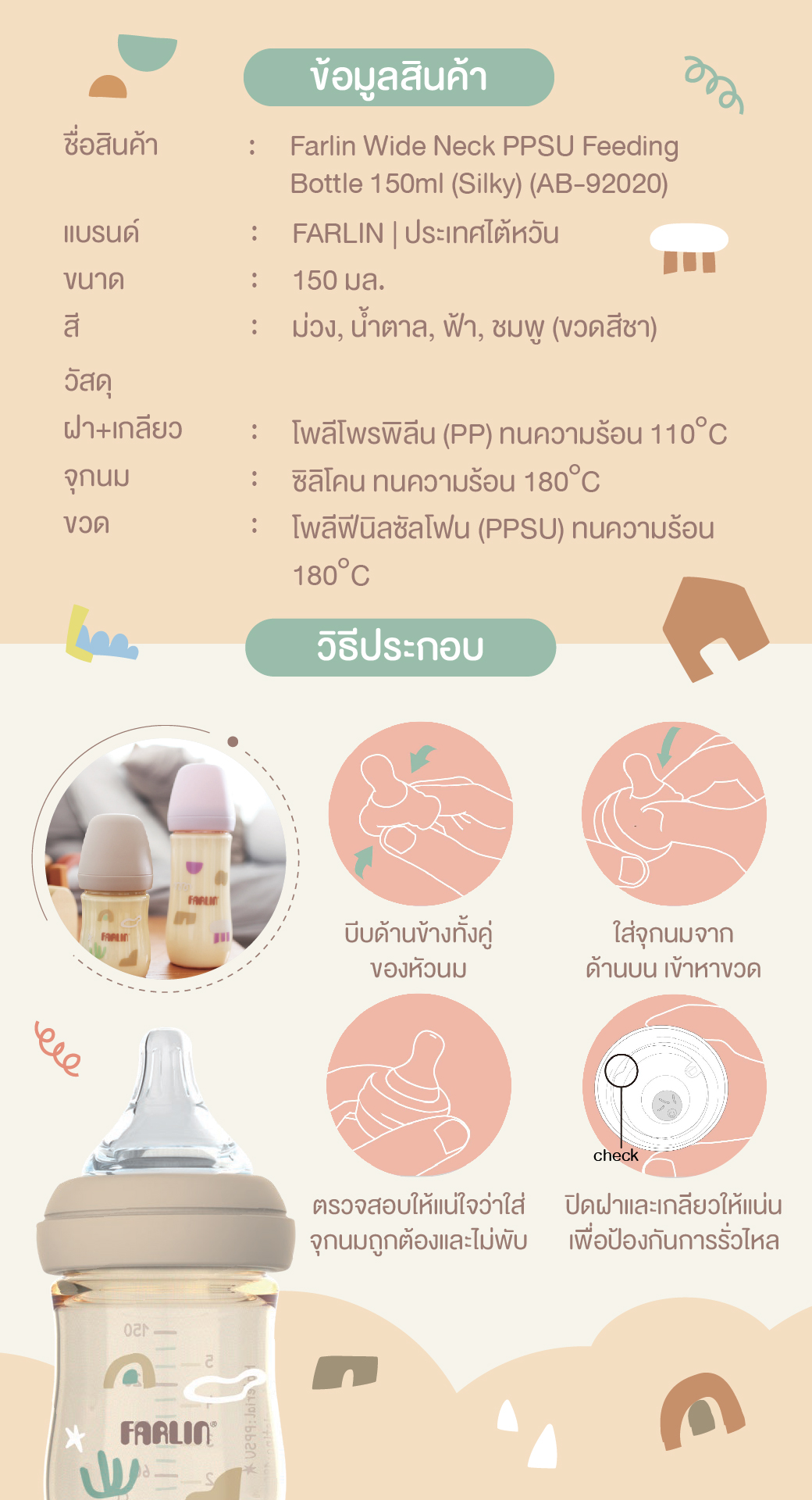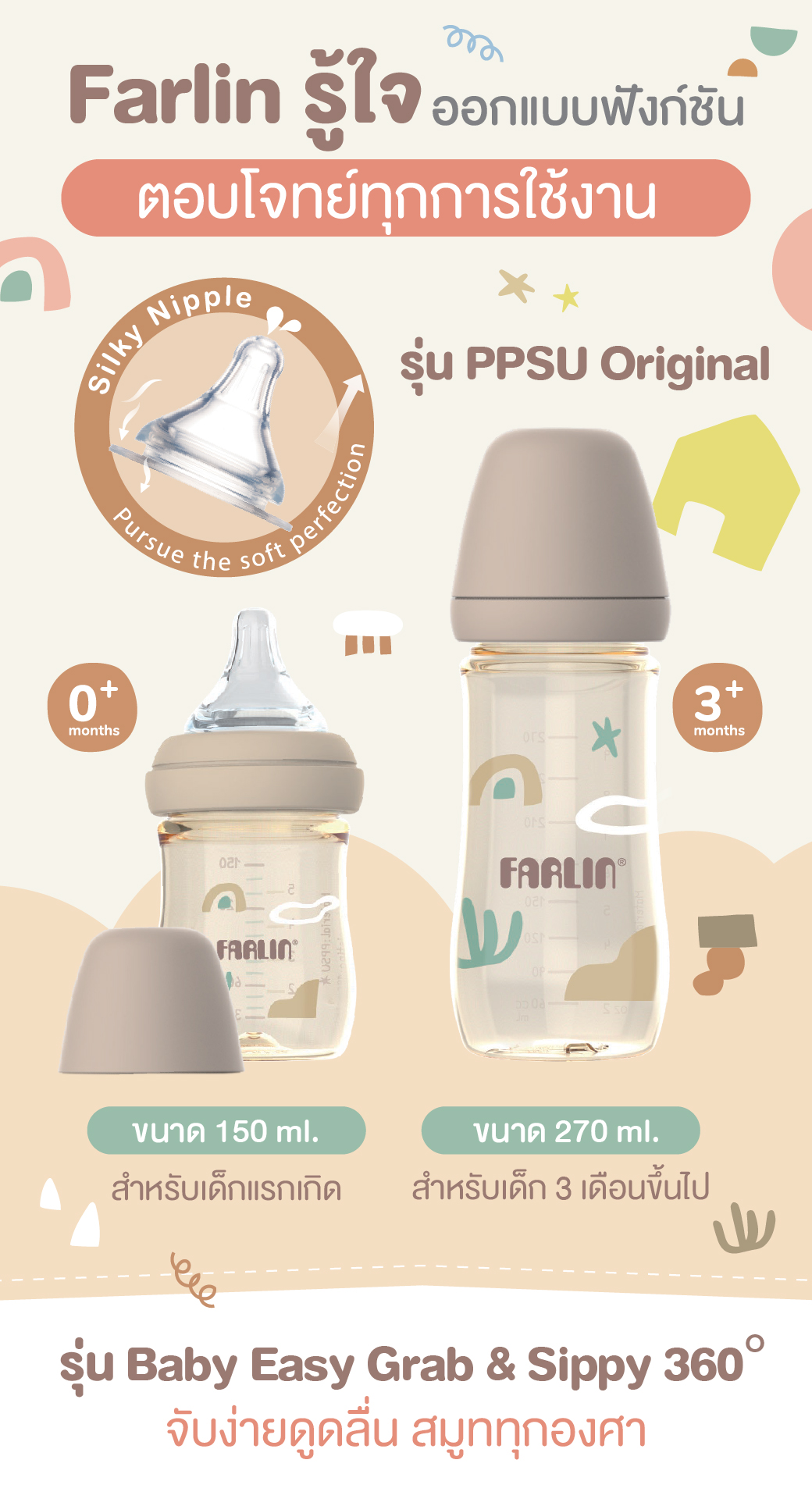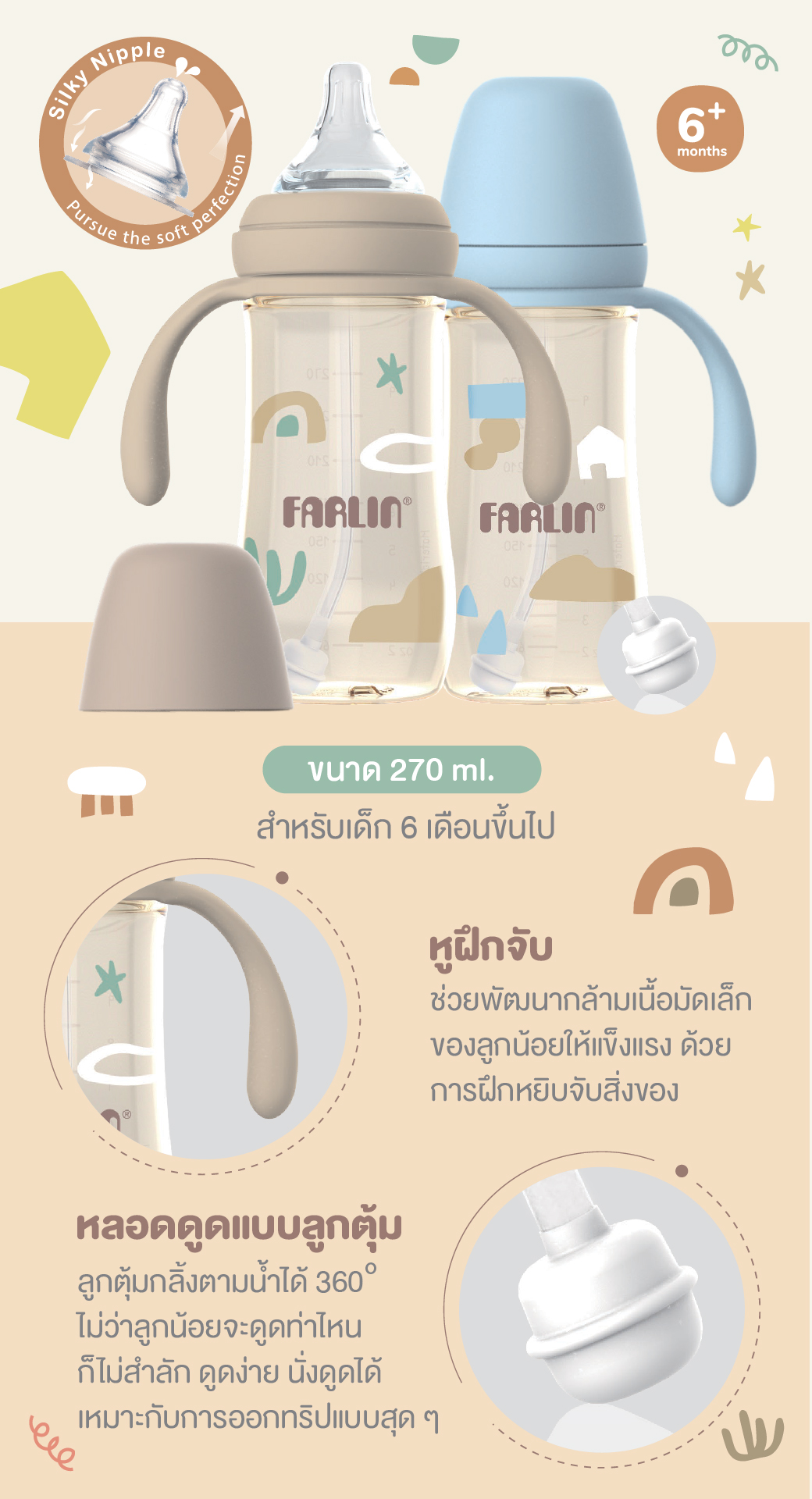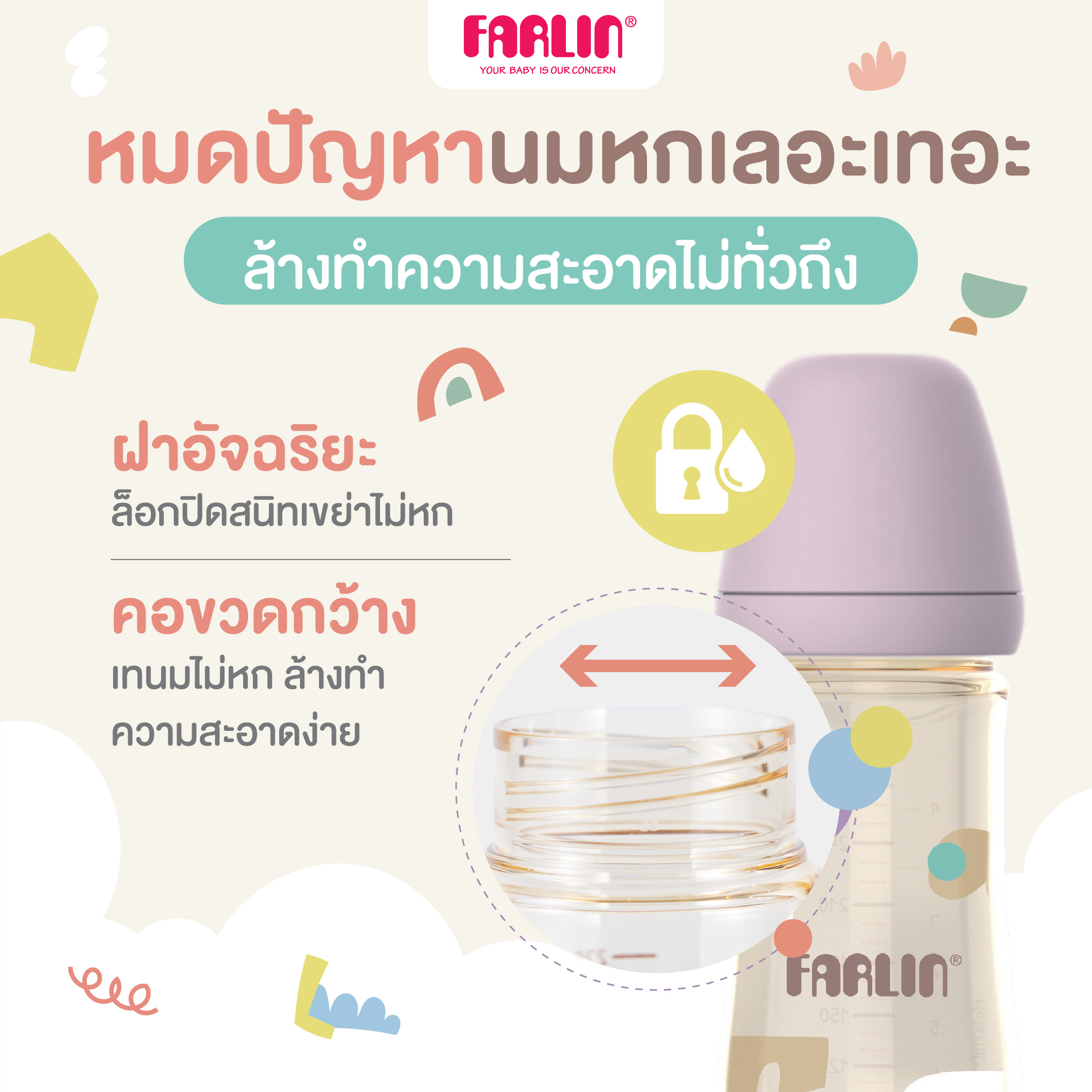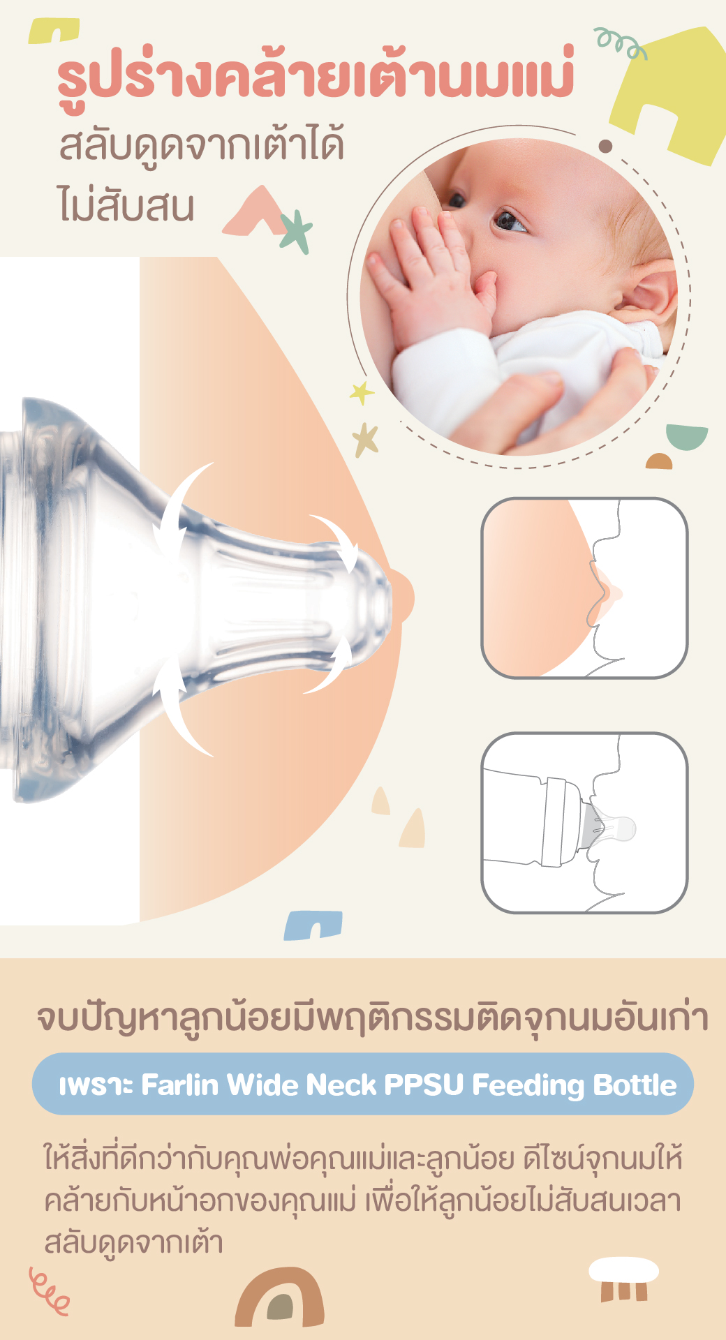 จบปัญหาลูกน้อยมีพฤติกรรมติดจุกนมอันเก่า เพราะ Farlin Wide Neck PPSU Feeding Bottle ให้สิ่งที่ดีกว่ากับคุณพ่อคุณแม่และลูกน้อย ดีไซน์จุกนมให้คล้ายกับหน้าอกของคุณแม่ เพื่อให้ลูกน้อยไม่สับสนเวลาสลับดูดจากเต้า