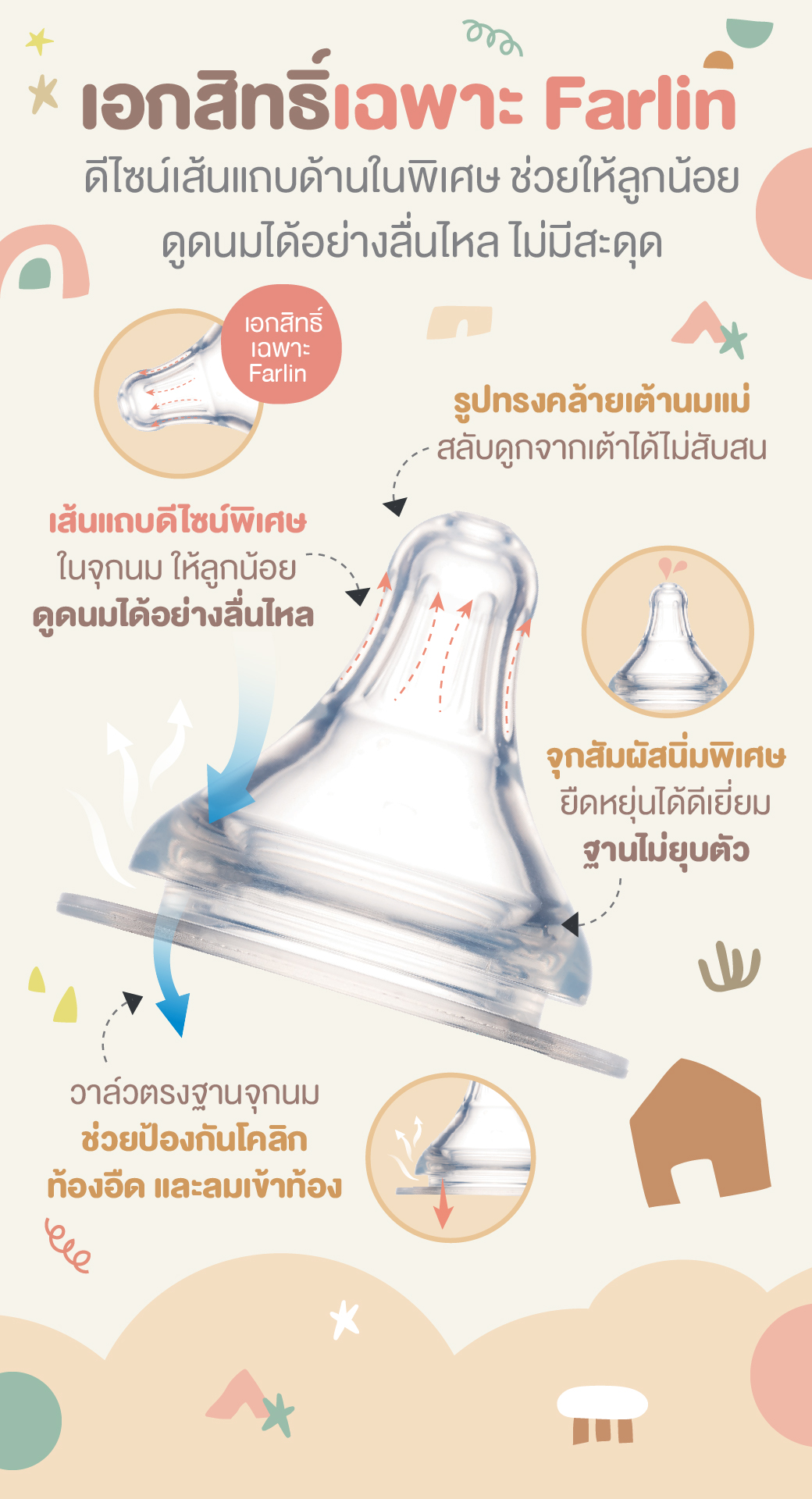 ✅เส้นแถบดีไซน์พิเศษในจุกนม เอกสิทธิ์เฉพาะ Farlin ให้ลูกน้อยดูดนมได้ อย่างลื่นไหลไม่มีสะดุด