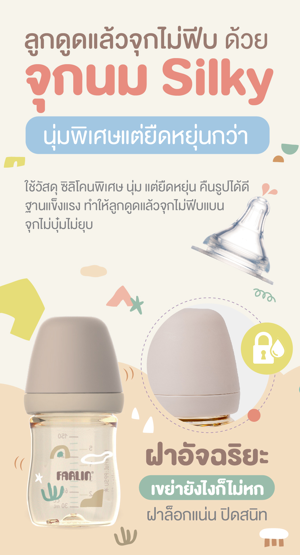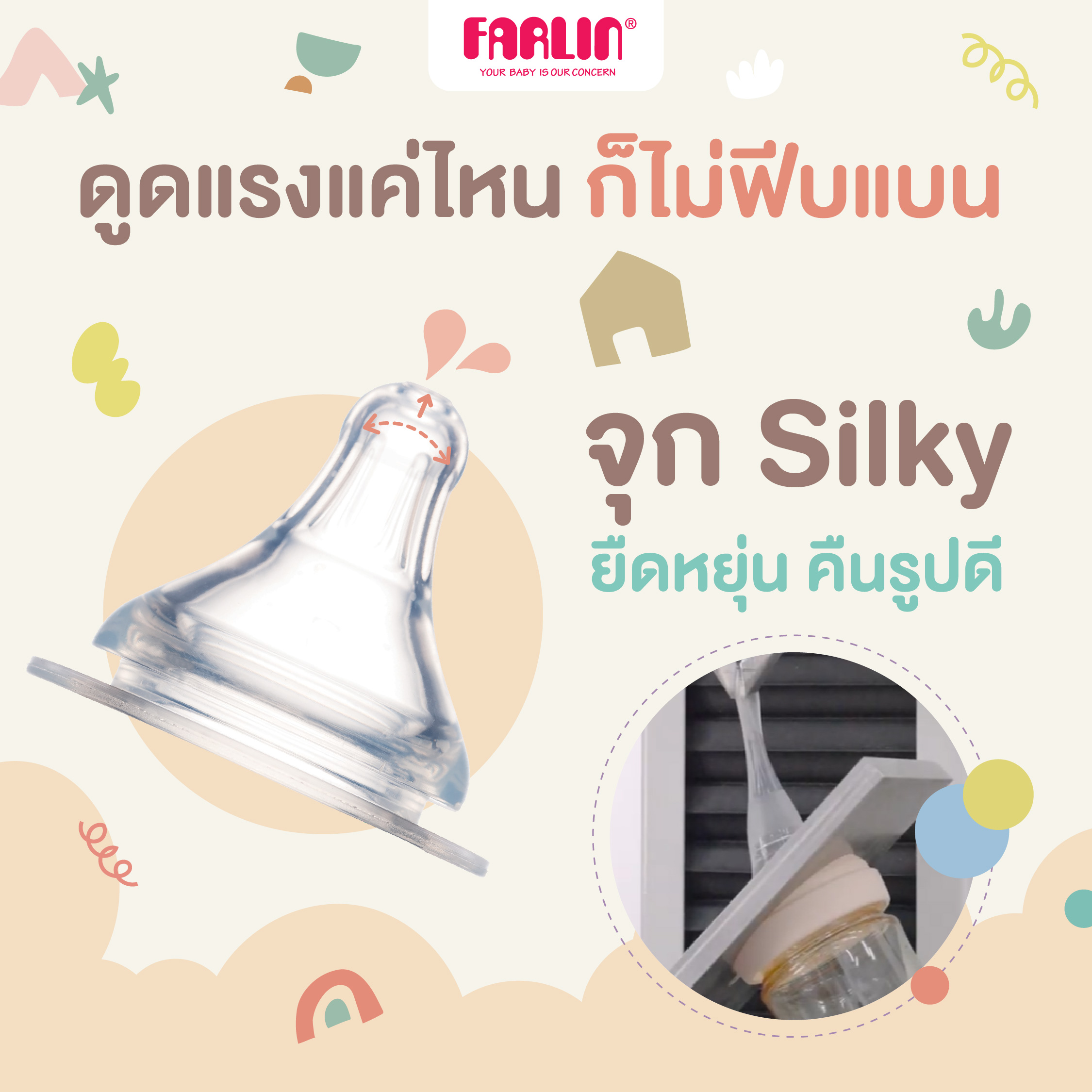 ✔️ลูกดูดแล้วจุกไม่ฟีบ ด้วย จุกนม Silky นุ่มพิเศษ แต่ยืดยุ่นกว่า