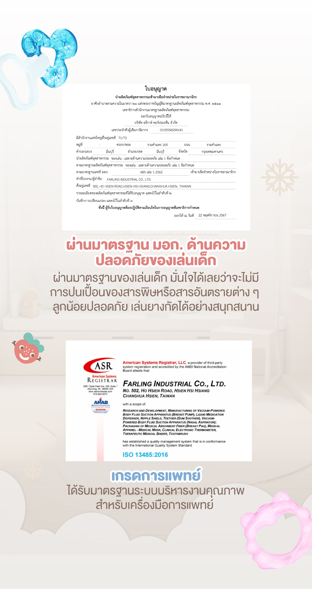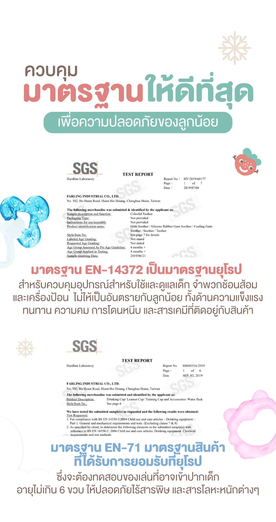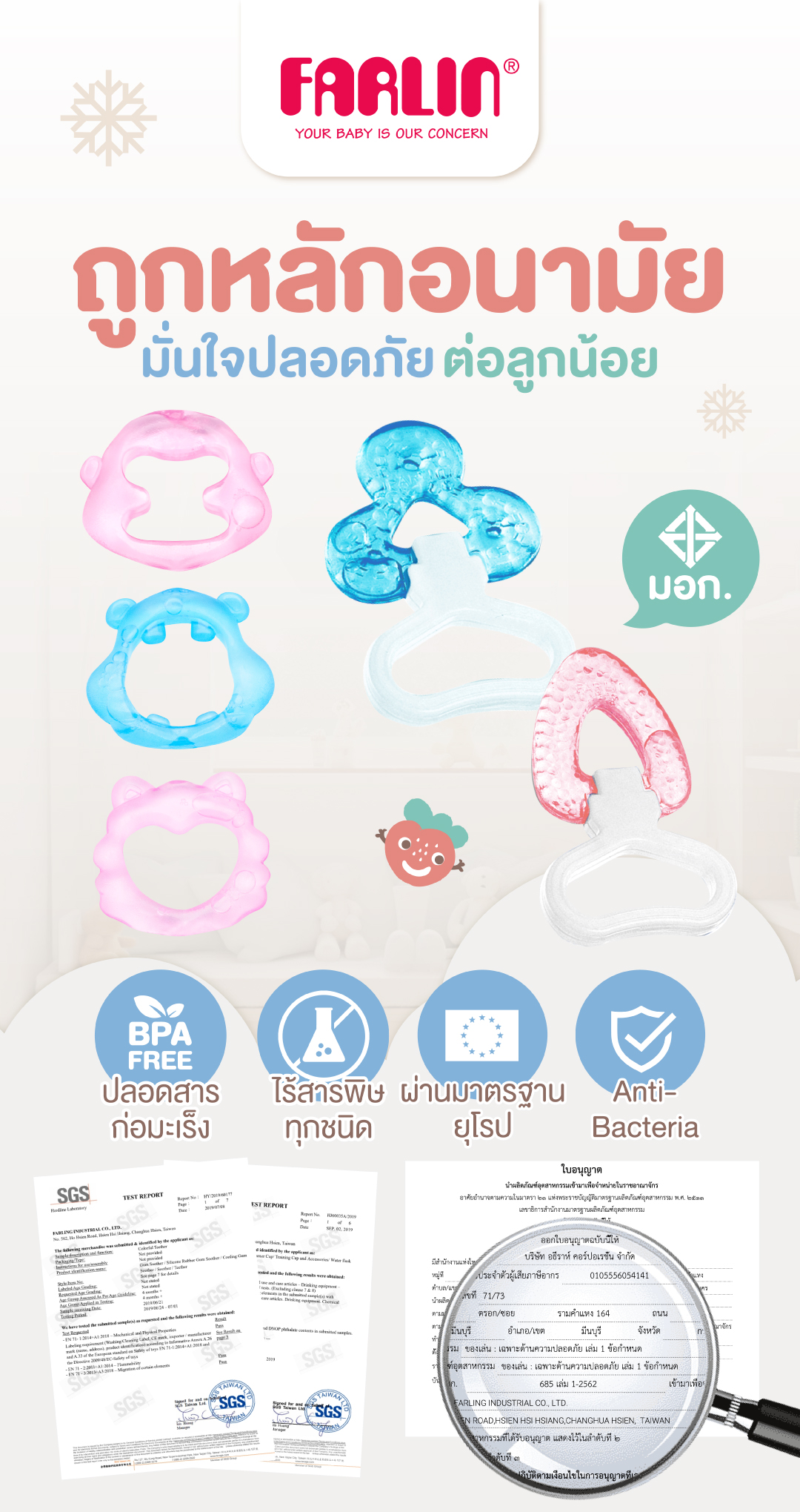 ผ่านมาตรฐานของเล่นเด็ก มั่นใจได้ว่าจะไม่มีการปนเปื้อนของสารพิษหรือสารอันตรายต่าง ๆ ลูกน้อยปลอดภัย เล่นยางกัด Farlin ได้อย่างสนุกสนาน