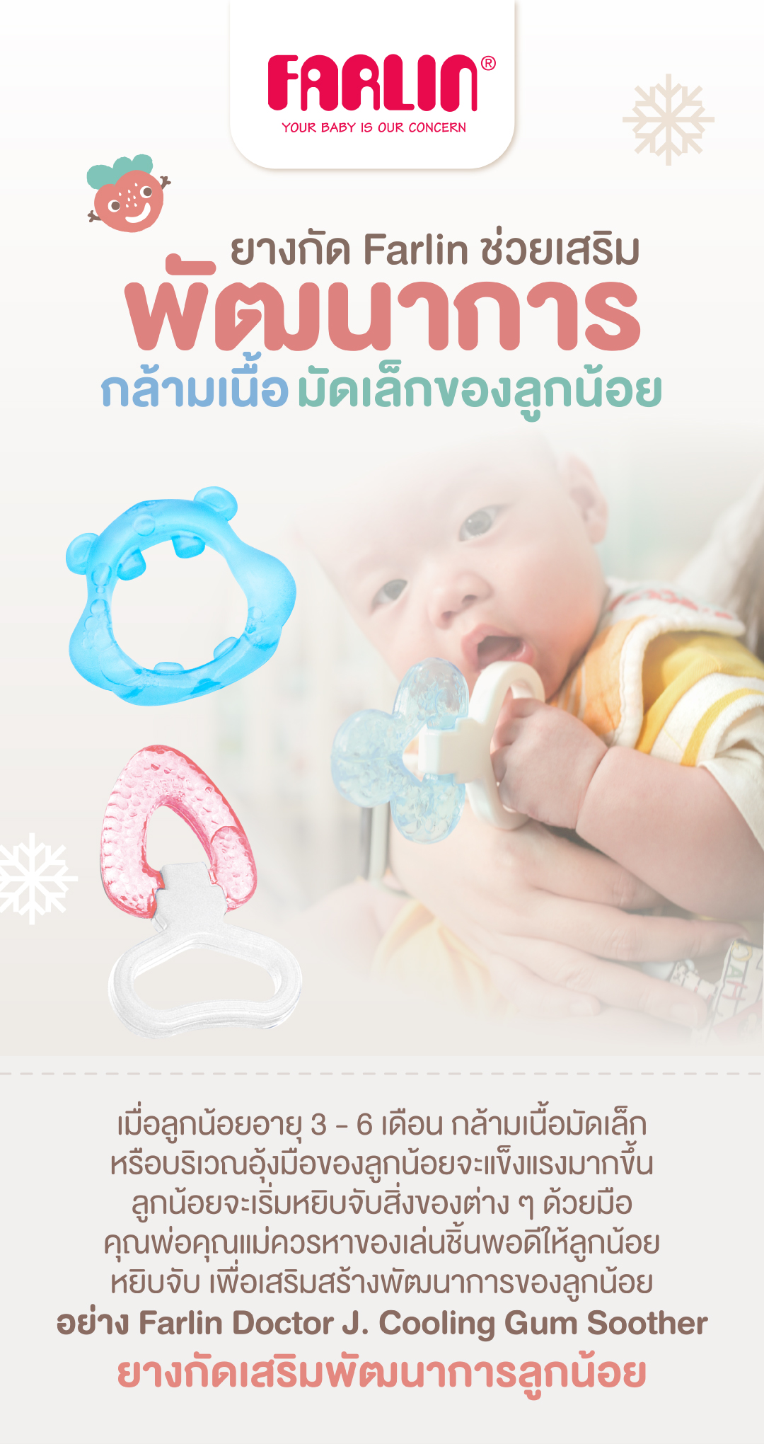 เมื่อลูกน้อยอายุ 3 - 6 เดือน กล้ามเนื้อมัดเล็กหรือบริเวณอุ้งมือของลูกน้อยจะแข็งแรงมากขึ้น ลูกน้อยจะเริ่มหยิบจับสิ่งของต่าง ๆ ด้วยมือ คุณพ่อคุณแม่ควรหาของเล่นชิ้นพอดีให้ลูกน้อยหยิบจับ เพื่อเสริมสร้างพัฒนาการของลูกน้อย อย่าง Farlin Doctor J. Cooling Gum Soother ยางกัดเสริมพัฒนาการลูกน้อย