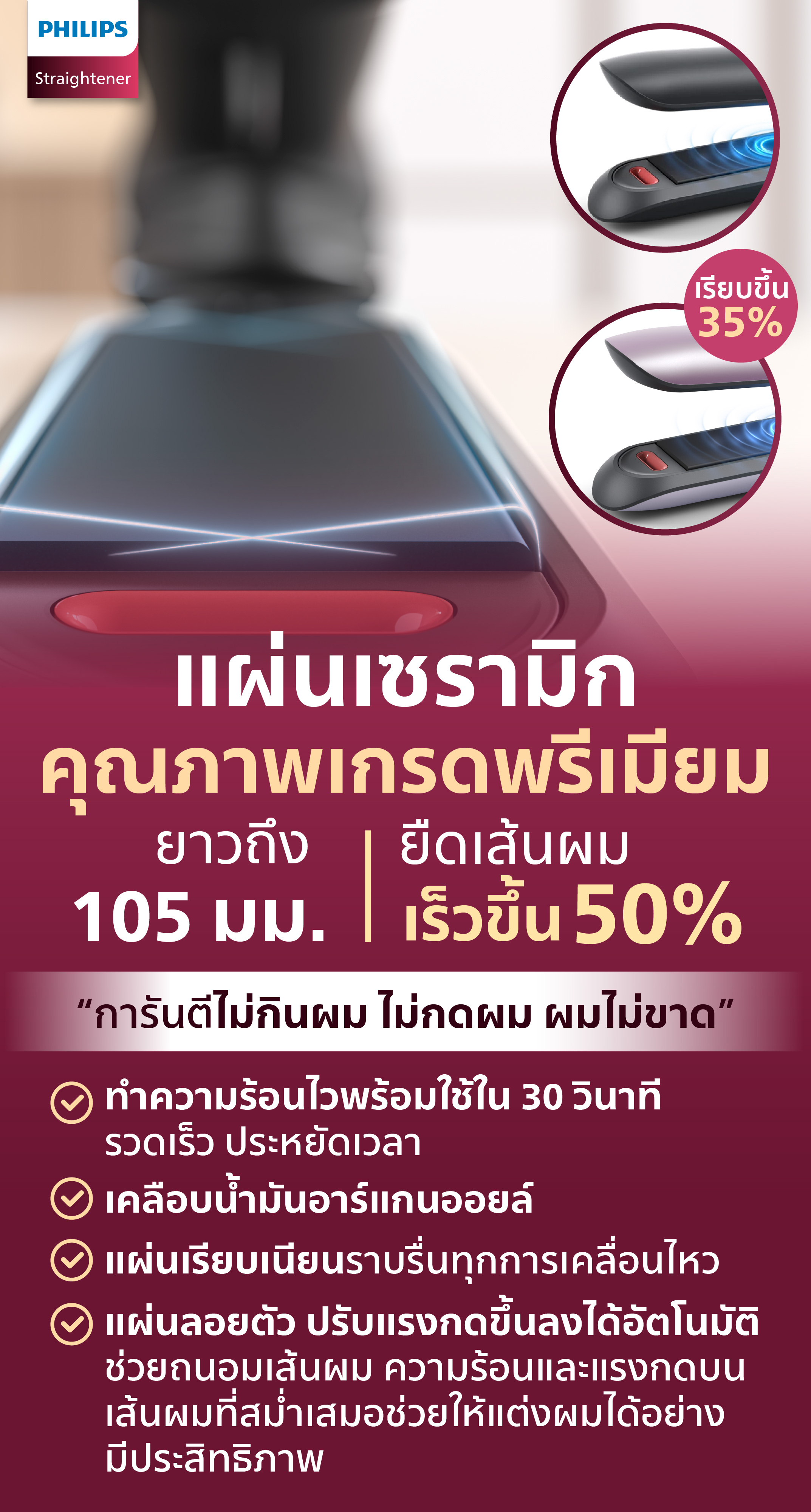 ยาวถึง 105 มม. ยืดเส้นผมได้เร็วขึ้นถึง 50%