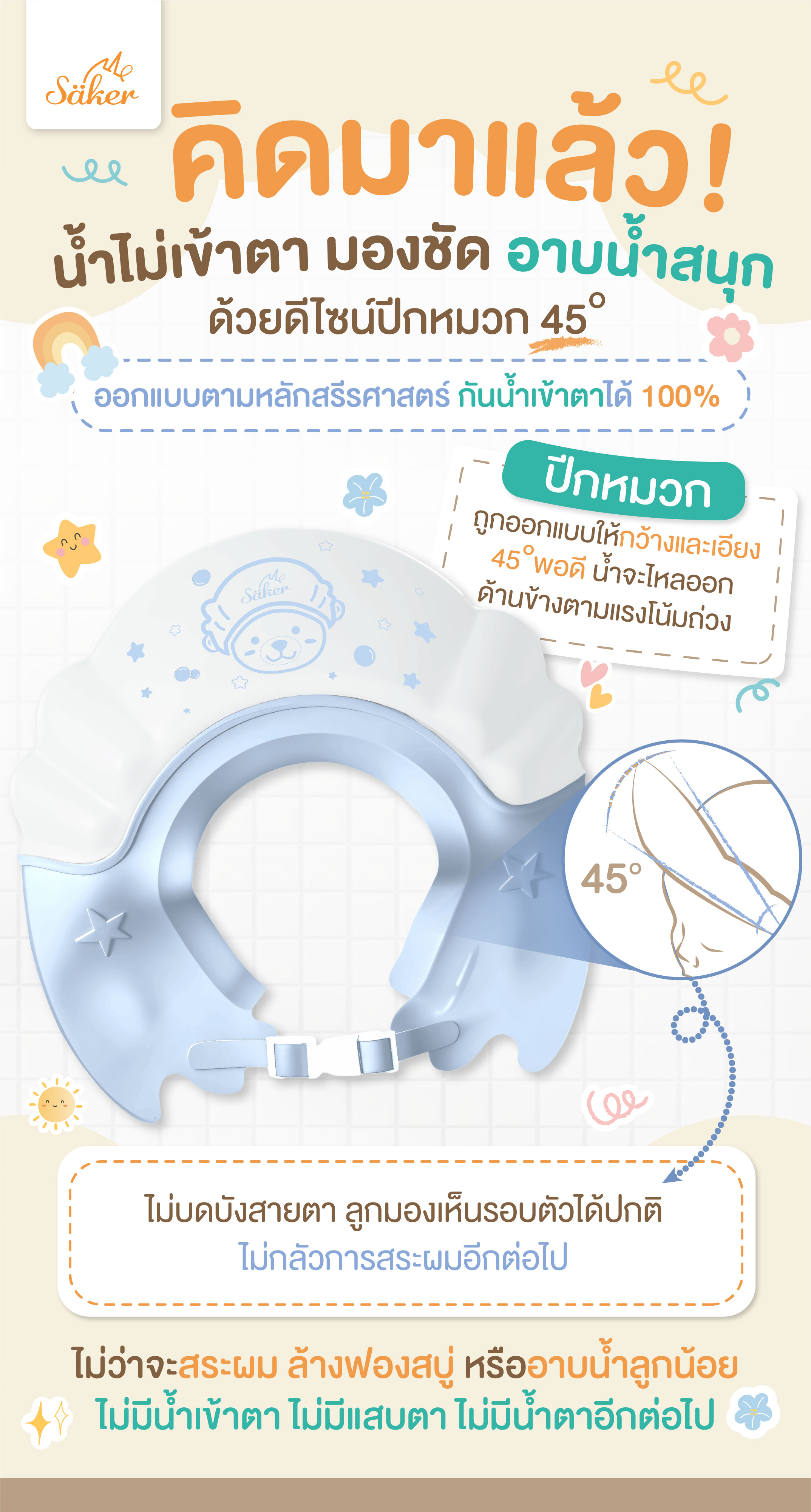 ดีไซน์ ปีกหมวก 45° โค้งรับศีรษะ ป้องกันน้ำและแชมพูไหลเข้าตา