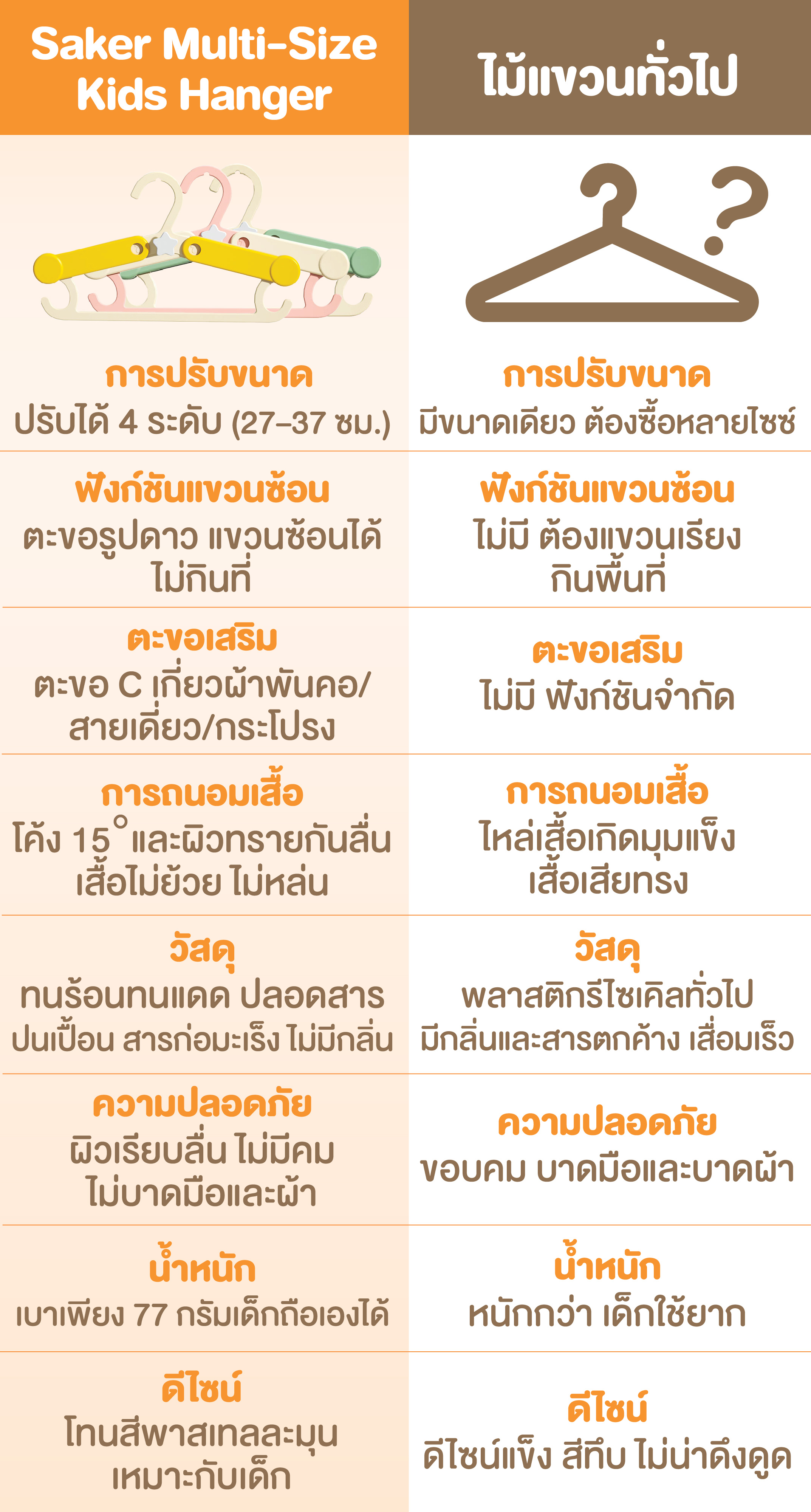 📊 เปรียบเทียบ Saker Multi-Size Kids Hanger vs ไม้แขวนทั่วไป