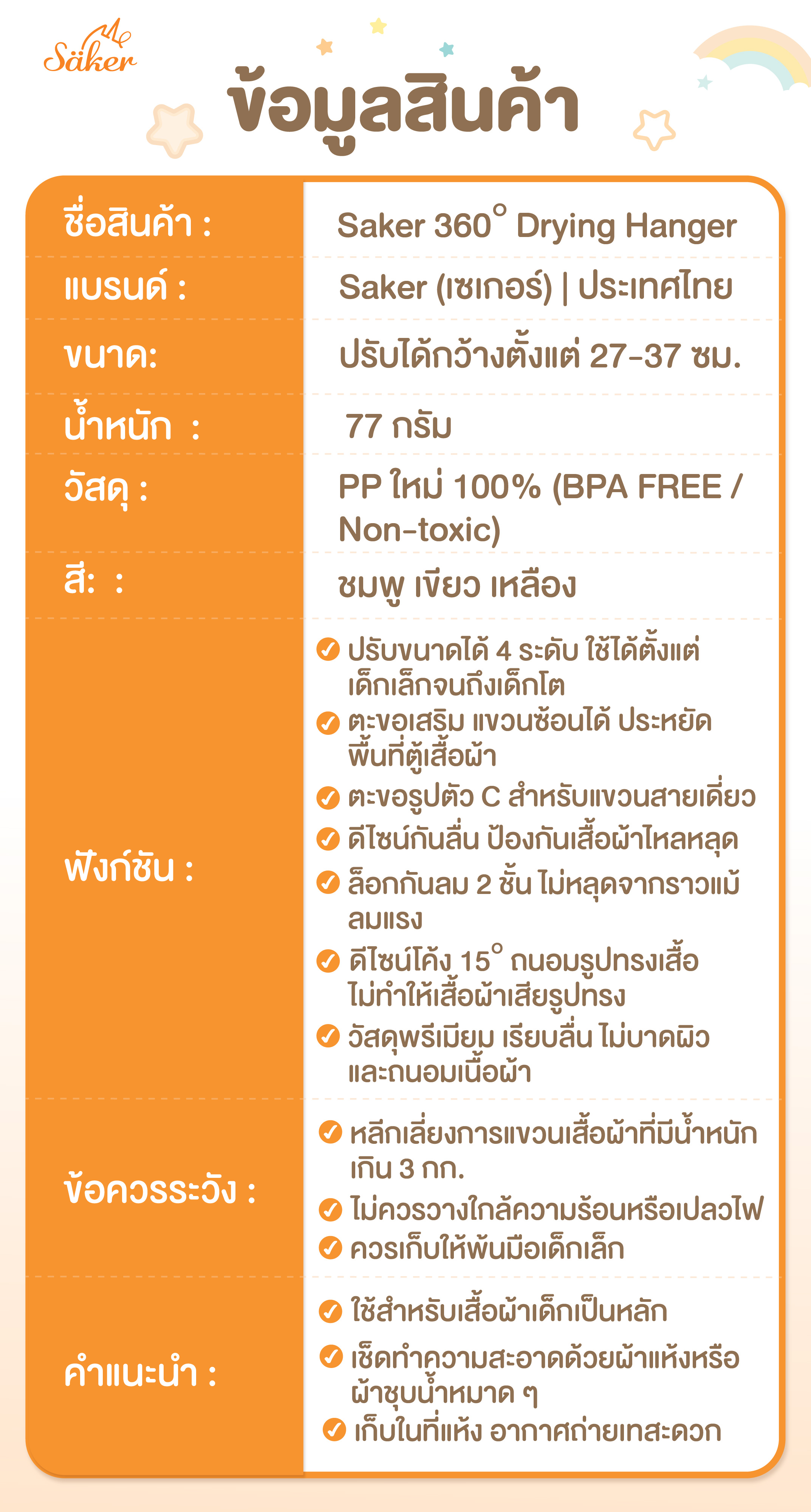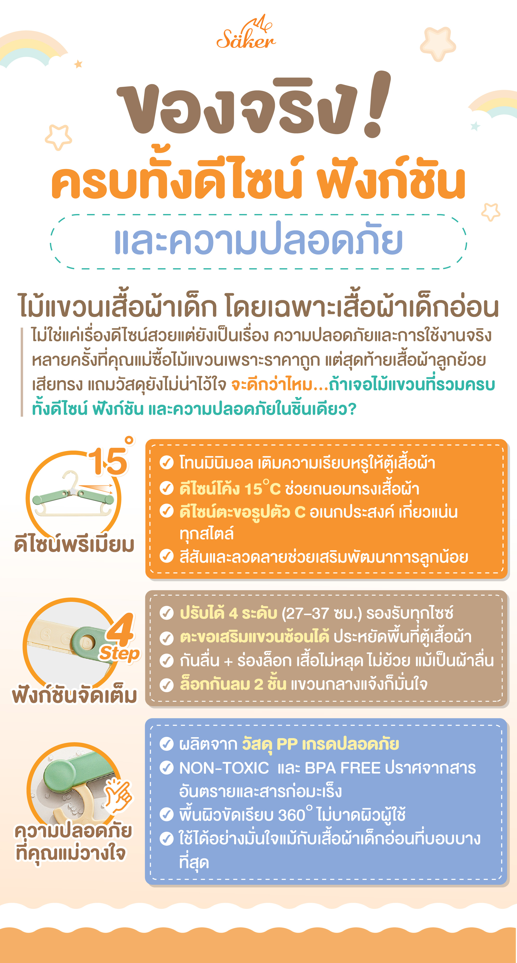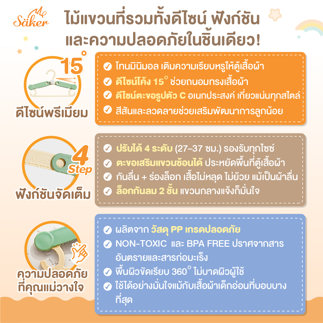 Saker ปรับได้ถึง 4 ระดับ (27–37 ซม.) ใช้ได้ตั้งแต่ทารกจนถึงวัยรุ่น ในขณะที่ไม้แขวนทั่วไปมีเพียงขนาดเดียว ต้องซื้อหลายไซซ์จึงจะพอ
