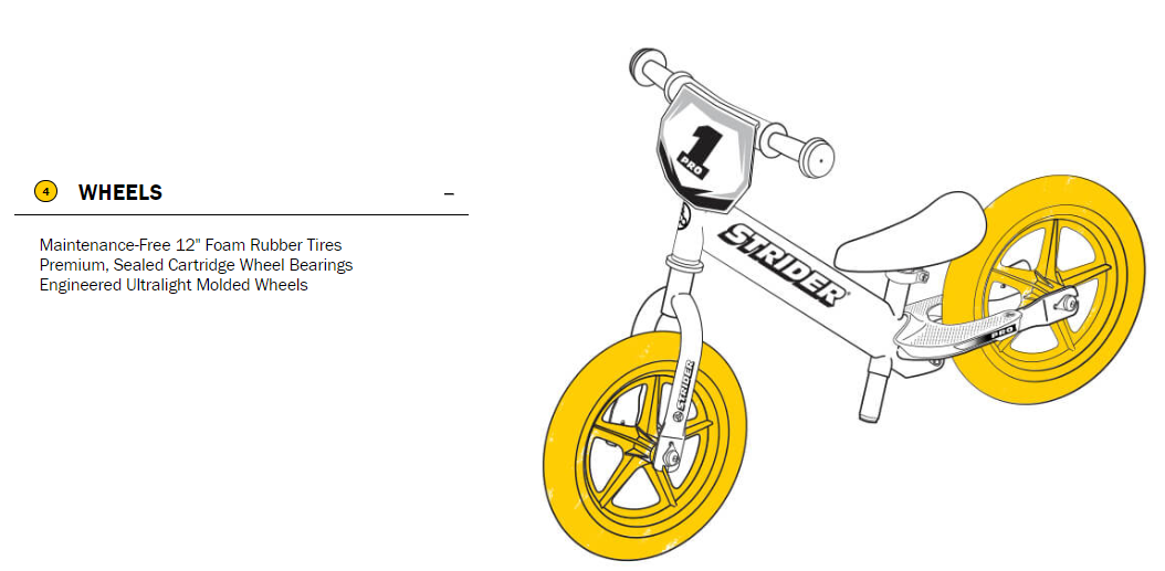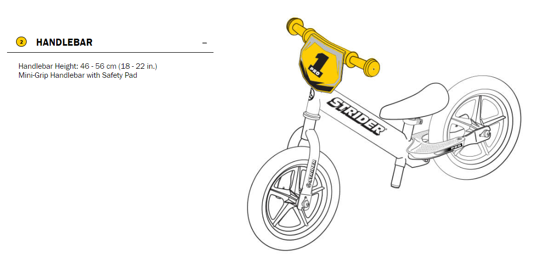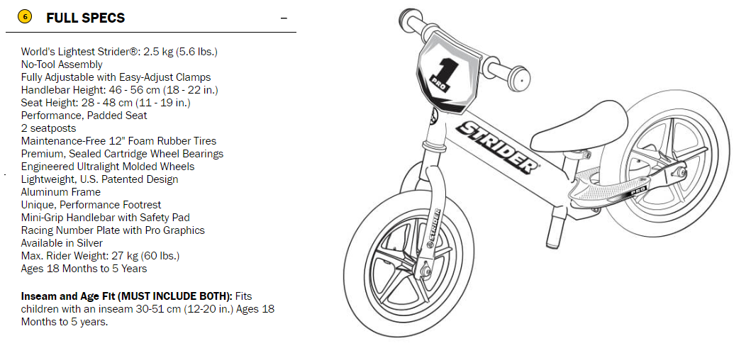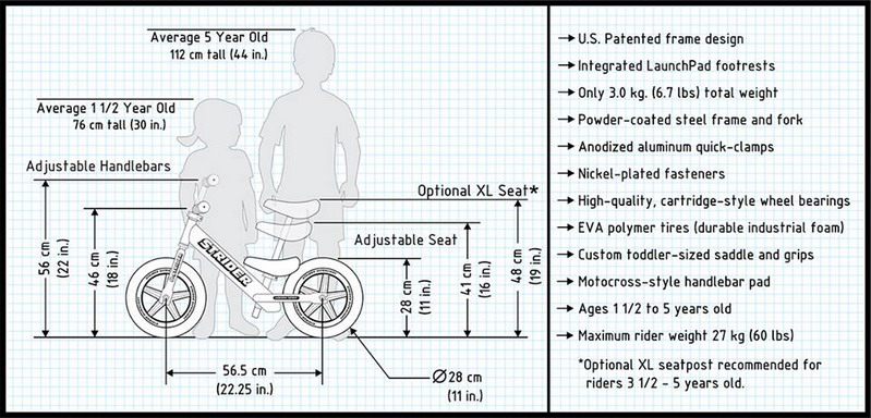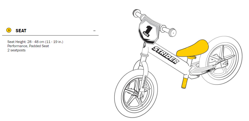With a seat height range from 28-48 cm (11-19 in.), the Strider 12 Pro perfectly fits children with an inseam of 30-51 cm (12-20 in.).