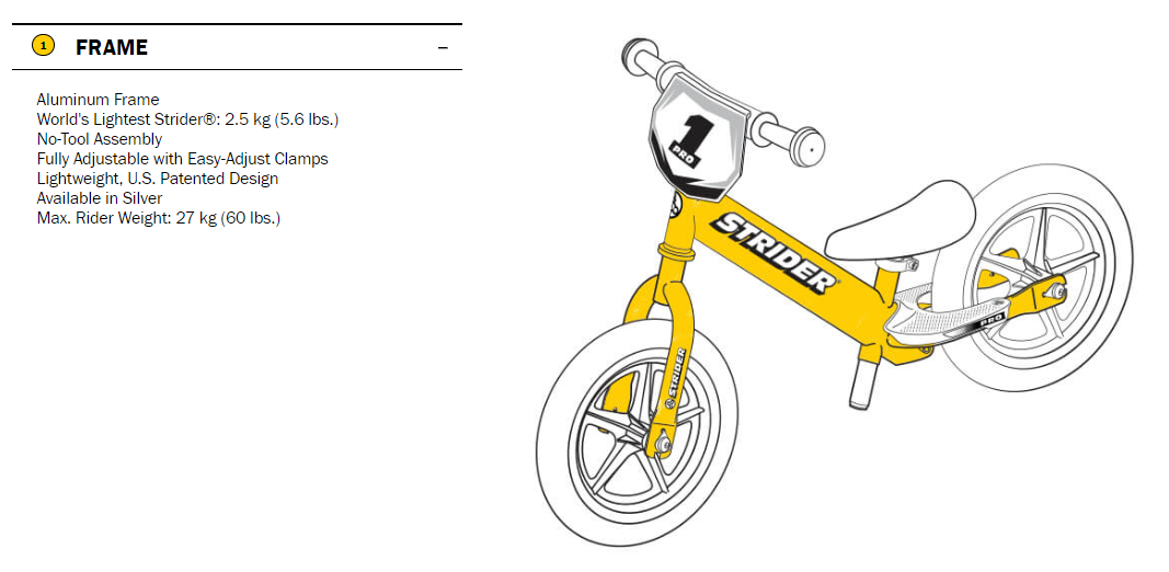 ![]() Alittle dirt never hurt anyone and a child who wants to go fast and get dirty needs the right tools. We create kids who have the moxie to say, “Bring it on. Challenge me. I’m ready, world.” The Strider 12 Pro Balance Bike is the bike of choice for kids who don’t just want to go fast but need to go fast… the rest of the world will catch up later, if it can. Not even a full diaper is enough to slow the 12 Pro down. Designed for little racers, the premium Strider 12 Pro Balance Bike is the ultra-light, high-end bike for tiny speed demons who crave the wind in their face and freedom at their fingertips. An all-aluminum frame that barely tips the scale at 2.54 kg (5.6 lbs.), a textured performance footrest, and an official Strider number plate all mean your little dirt devil is going to be spinning up tornadoes around the other kids at the park.