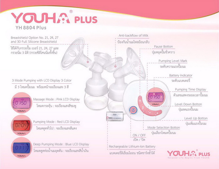 เครื่องปั๊มนม Youha YH-8004+ ได้รับการออกแบบให้เหมาะ กับคุณแม่ยุคใหม่ ซึ่งต้องการความคล่องตัว และความทัันสมัย ด้วยดีไซต์่สวยหรู แต่ขนาดกะทัดรัด จึงเป็นเครื่องปั๊มนมที่ได้รับ ความนิยมอย่างสูง สามารถใช้ได้ทั้งไฟบ้านและแบตเตอรี่